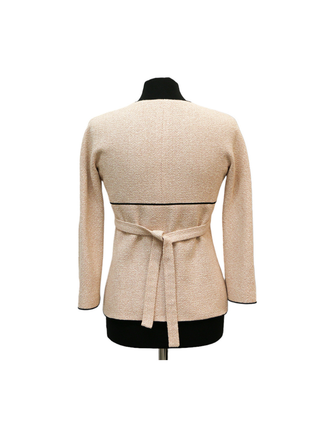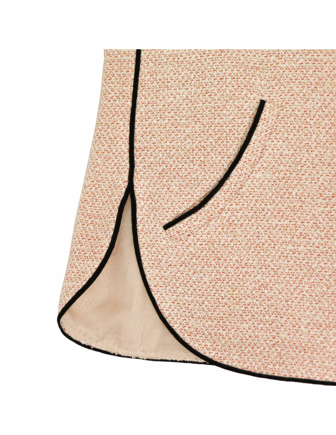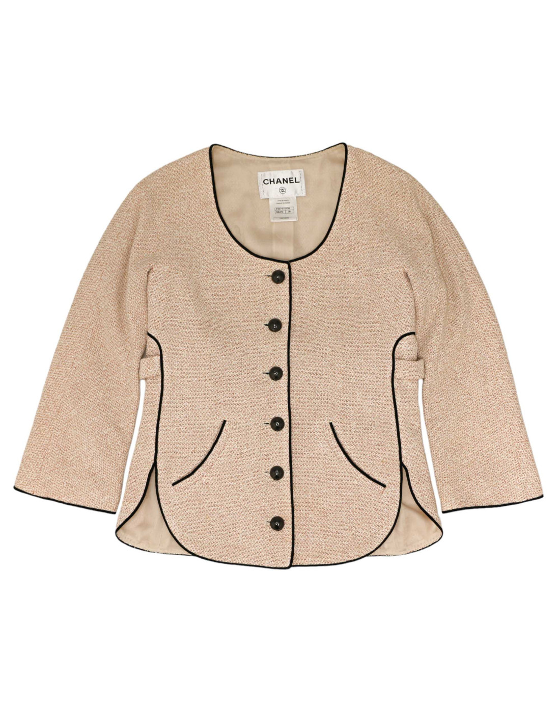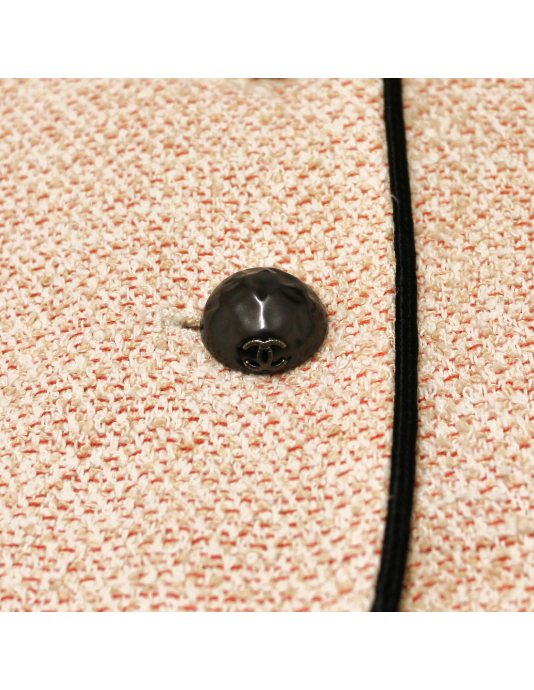 This Chanel jacket is in mottled pink tweed with black silk piping. It has 2 pockets that are still sewn.