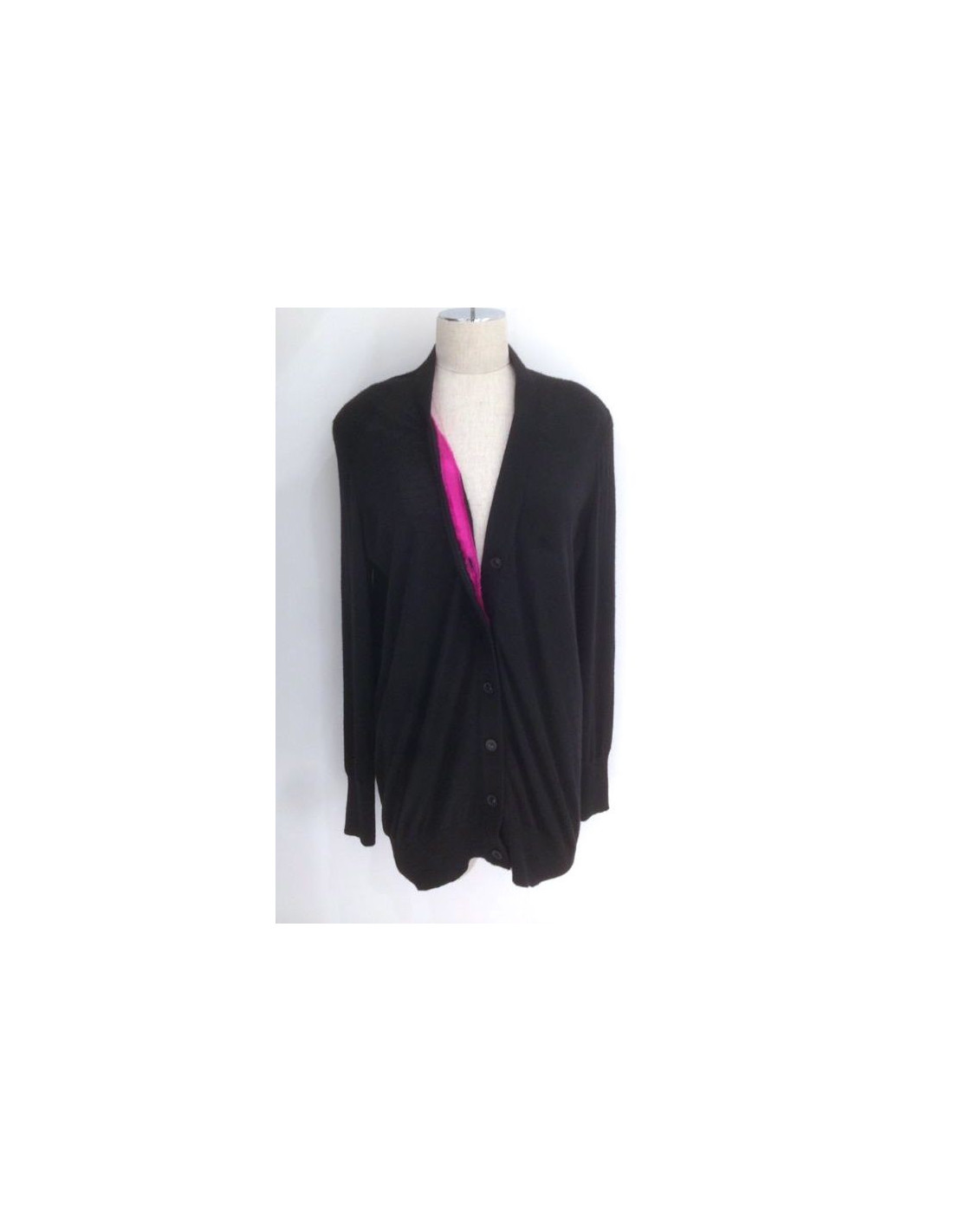 Black CHANEL jacket, size 40 in 100% cashmere. This sumptuous vest features a beautiful liseret fringed wide 100% silk Fuchsia inside the neck and the buttonhole (color scheme when the vest is worn unbuttoned). Black mother of Pearl buttons are acronyms"Chanel Paris". A beautiful label black silk, on which is inscribed"Chanel"is embroidered inside the vest.