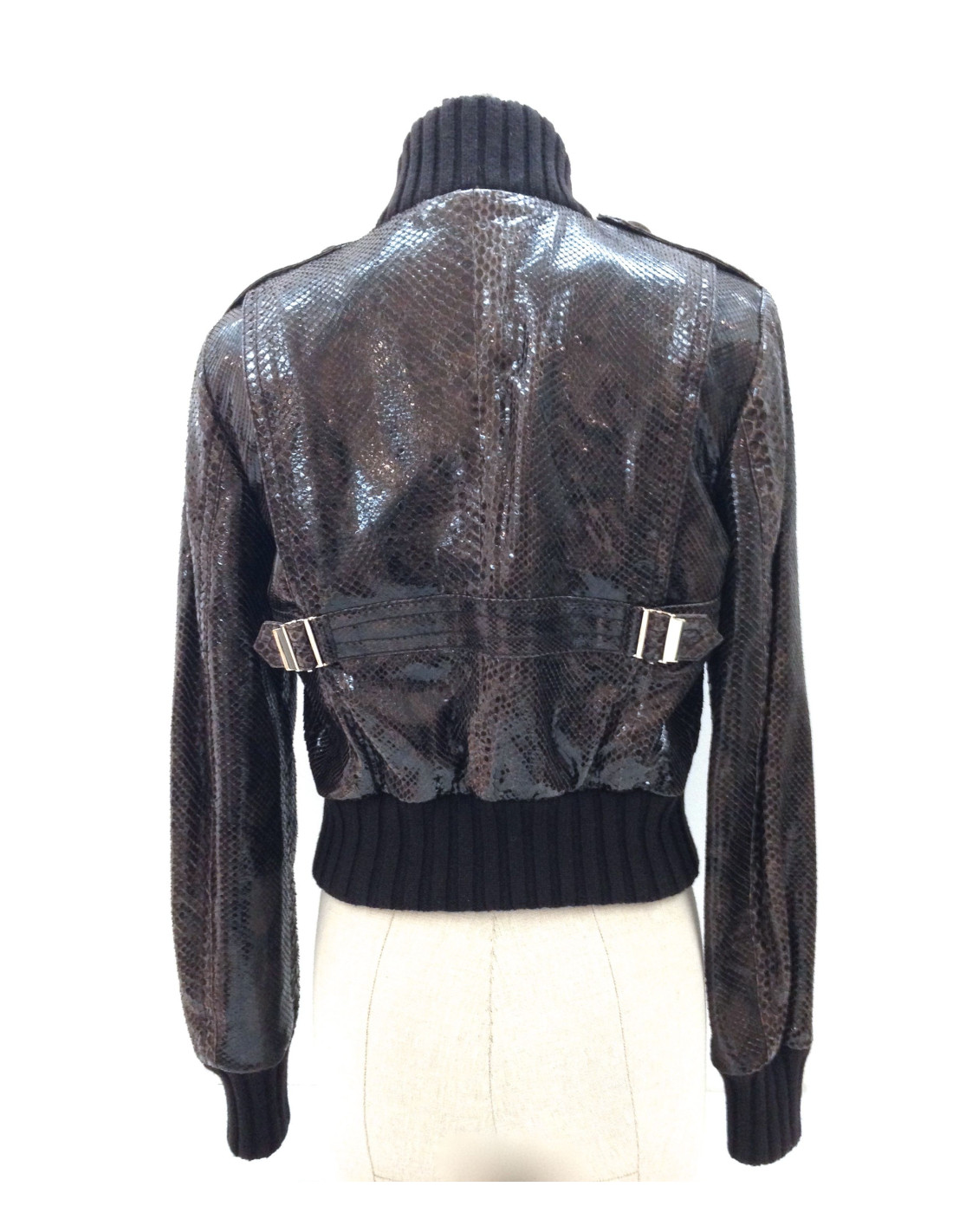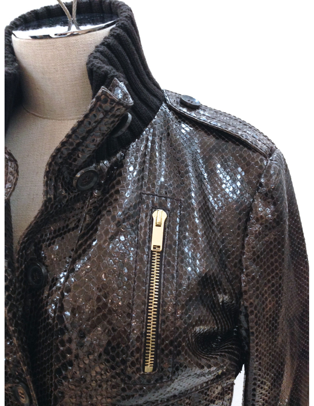 GUCCI jacket, size 36 no size label, in bright natural python brown leather-lined. RARE piece. Pockets with zippers color gold seal "GUCCI". Made in Italy. Collar, armholes and bottom yokes edge-side (Brown cotton) jacket. GUCCI monogrammee Brown silk lining. Closure buttons apparent acronyms "GUCCI". Legs buttoned on the shoulders with buttons. Pockets pockets chest and double bellows with flaps buttoned and welt pockets. Pliers bellows back enhanced by a belted cut ribs. Length: 51 cm, Sleeve length: 63 cm Shoulder width: 36 cm, Chest width: 47 cm