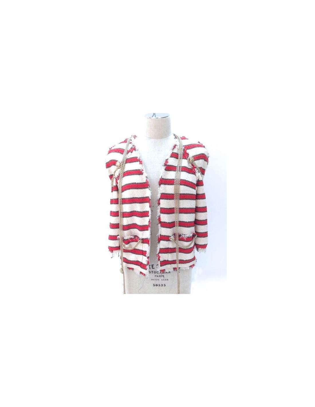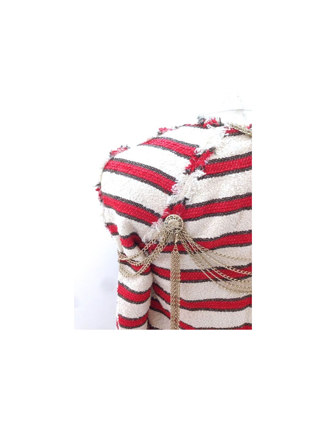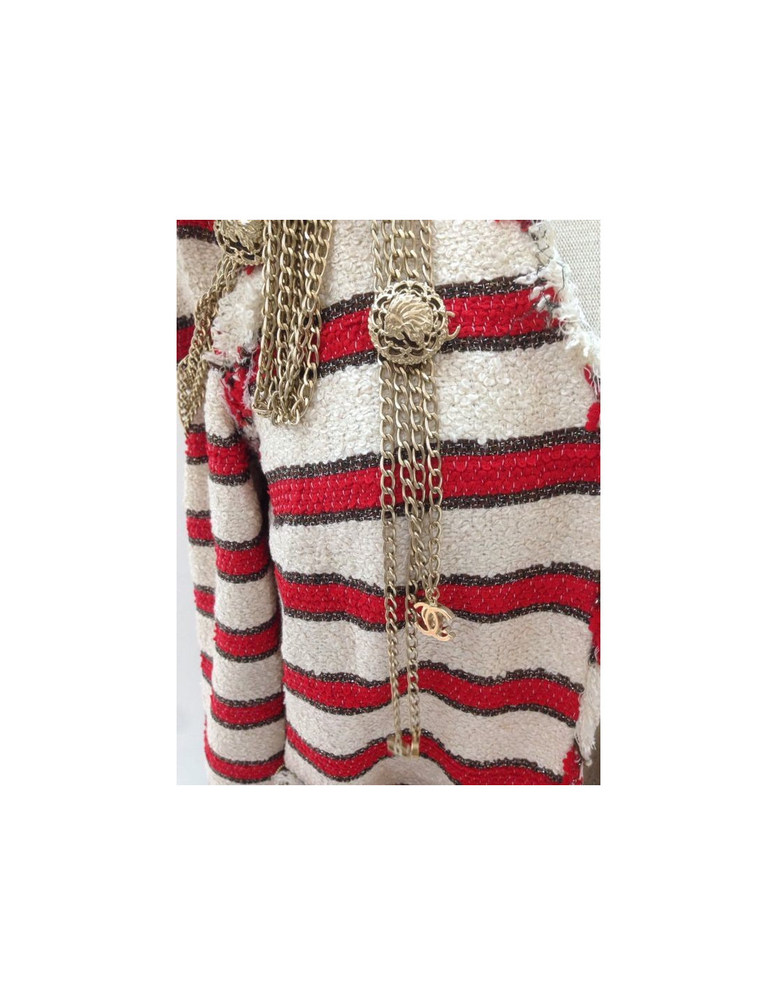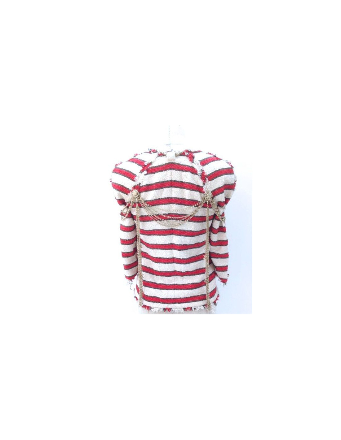 CHANEL jacket, size 36, spring-summer 2008 collection. EXCEPTIONAL piece. This gorgeous piece of collection is an off-white tweed, striped red and gold mat Couture fringed jacket. Internal epaulettes. "Lining 100% silk, in very good condition, sealed"Chanel"and embroidered designs camellias. 3/4 sleeves. Two small lower pockets with sublime golden metal chains and buttons in relief in form of lion's head and abbreviation CC. Group of five strings adorning the shoulders and back. On the back, two groups of strings and pendants CC are removable.