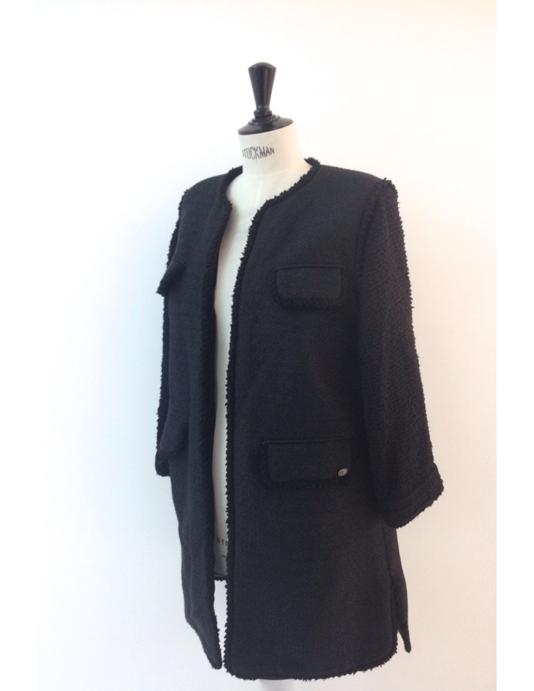 Long black tweed jacket CHANEL, size 40, very recent collection. Made in France. Overlays in wool and silk. This black tweed to the brilliant effects vestre color metal is embellished black tweed misregistration. Structuring epaulettes. Lining Black 100% silk, embroidered Camelias, acronyms CC, of inscriptions "Chanel rue Cambon". Sleeves in black tweed. Four beautiful pockets including two at the level of the chest, and two basses. On the lower left pocket, a pretty grey metal badge "CHANEL" is sewn.
