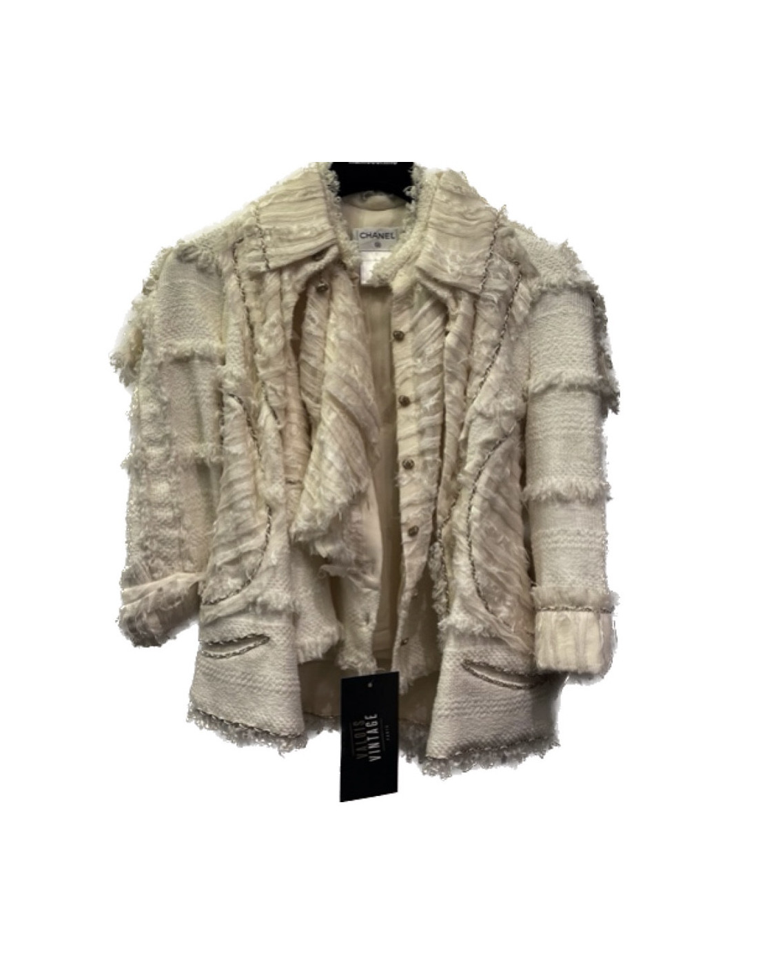Last items in stock JACKETS CHANEL Vintage jacket in ecru linen size 38FR CHANEL 21367 1,900.00 € Vintage! CHANEL jacket in ecru linen. It is equivalent to a size 38 FR (no size and material label). It is cut arched. It closes with five golden brushed CC buttons. In very good used condition. Dimensions flat: shoulder width 42 cm, length of the sleeves 59 cm, wrist circumference 26 cm, width of the bottom 50 cm. Add to cart