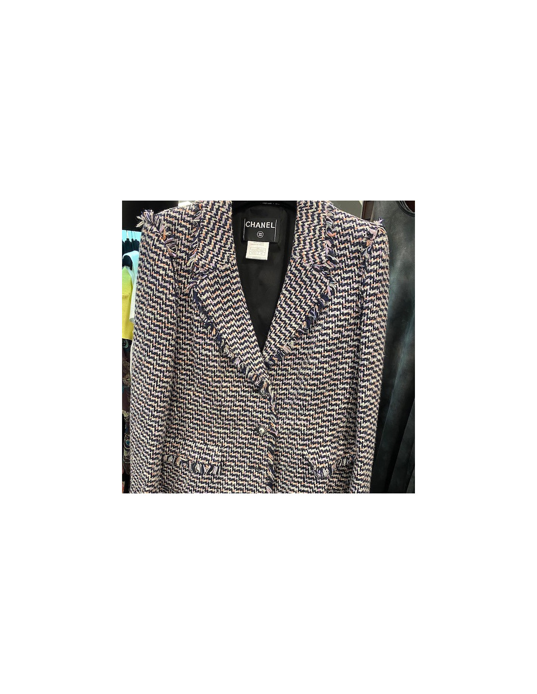 Last items in stock JACKETS CHANEL tweed jacket Size 42 FR CHANEL 33190 4,300.00 € CHANEL ochre and brown tweed jacket Condition : very goodMade in FranceSize : 42FRMaterials: acrylic, tweedLining : brown silkColors : ochre and multicolorMeasurements: shoulders 42 cm, underbust 46 cm, height 60 cm, sleeve length 58 cm, wrist 28 cmYear : Fall 2003Details : the jacket is multicolored in autumnal tones (brown, ochre...). Raglan sleeves,... Add to cart