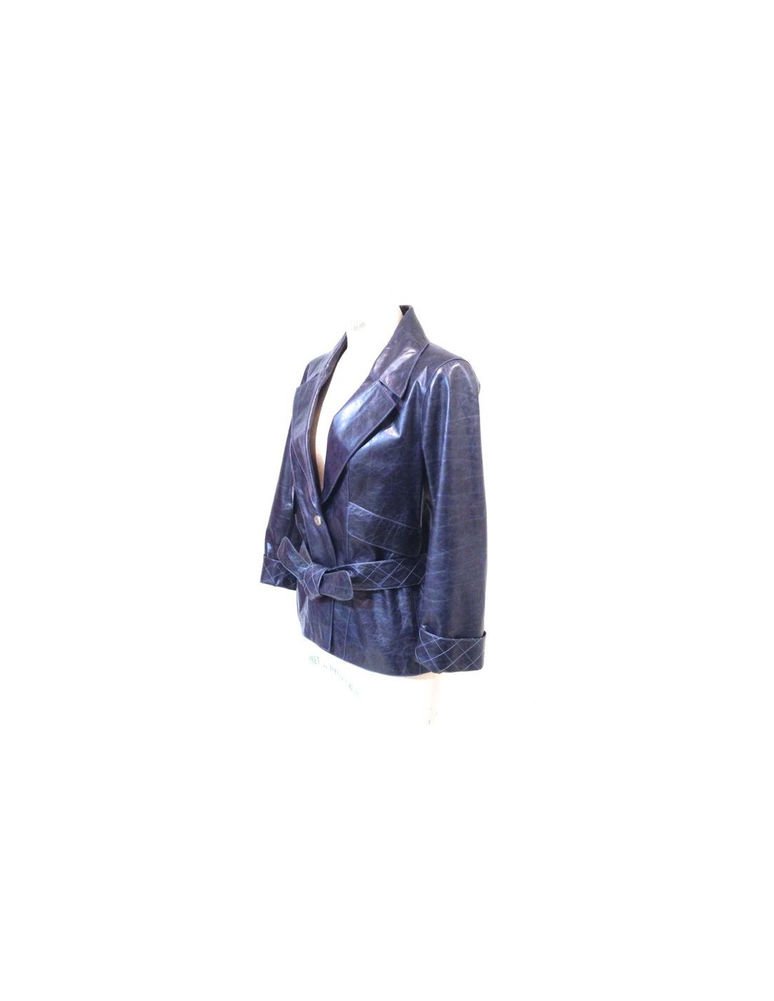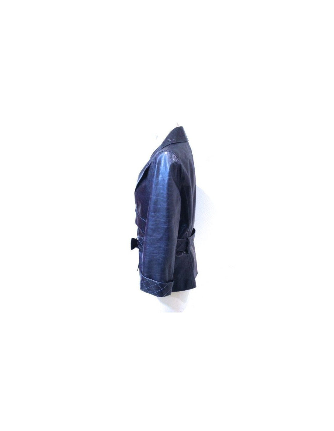CHANEL jacket in faded blue calfskin. The sleeves have a pretty quilted lapels. Two large flap pockets. Padded belt with loops back. Printed silk black and blue inner lining. In very good condition. A pretty silver initials CC button for bending the jacket.