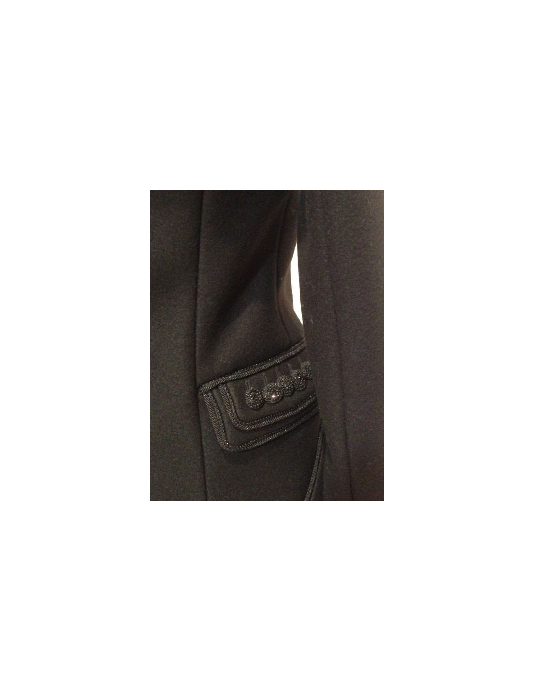 Jacket Tuxedo black DIOR for men that can be worn by a woman. Shape the tail coat jackets. Its allure is very structured. It is a unique piece, manufactured in a great dress fabric: wool (98%) and Kashmir (2%). Double edgings which one twisted and made of delicate black rhinestones. The jacket has two pockets. On each Pocket are sewn five beautiful buttons adorned with Rhinestones. Slot (17 cm) in the bottom of the back. You don't go unnoticed in a jacket cut and elegant as well. Made in Italy.
