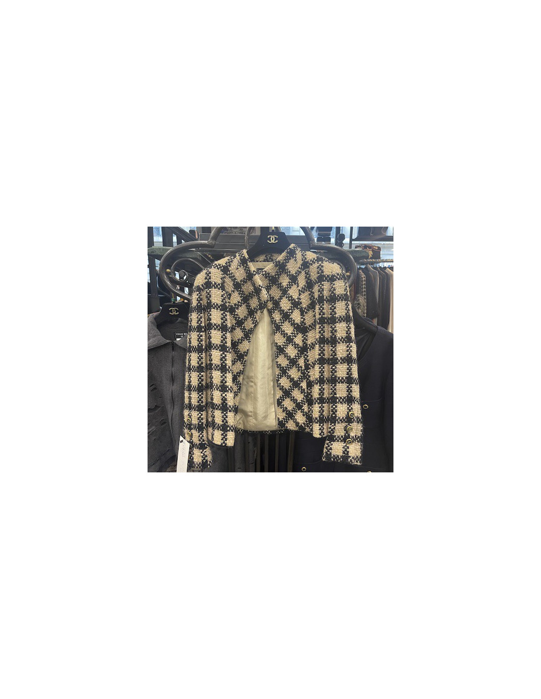 Last items in stock JACKETS CHANEL tweed jacket Size 46 FR CHANEL 33136 4,100.00 € Chanel black jacket Size 46 FR Condition : very goodMade in FranceSize : 46 FR (fits more like a 44FR)Materials : tweed, silkColors : black, white, green, blue, purpleButtons : green, silver, blackYear : Fall 2009 ready to wearMeasurements : shoulders: 42 cm, underbust: 56 cm, height: 64 cm, sleeve length: 52 cm, wrist: 30 cmDetails: black silk monogram... Add to cart