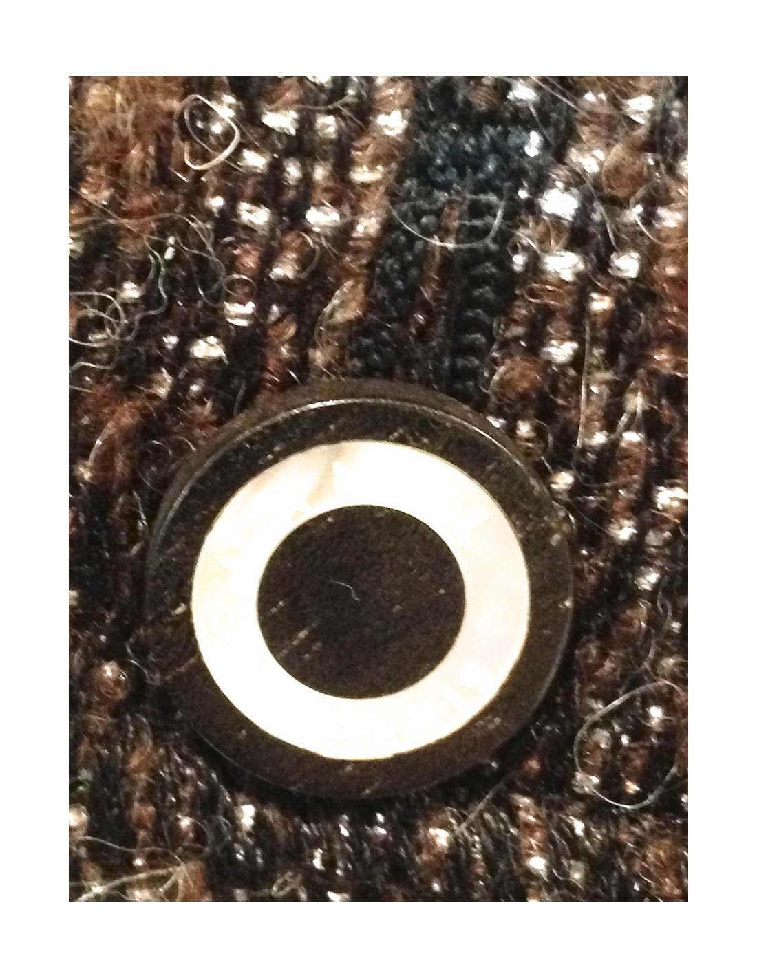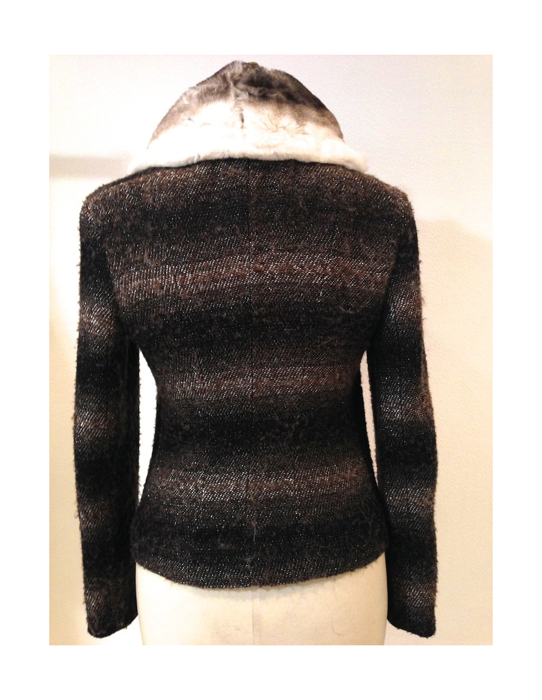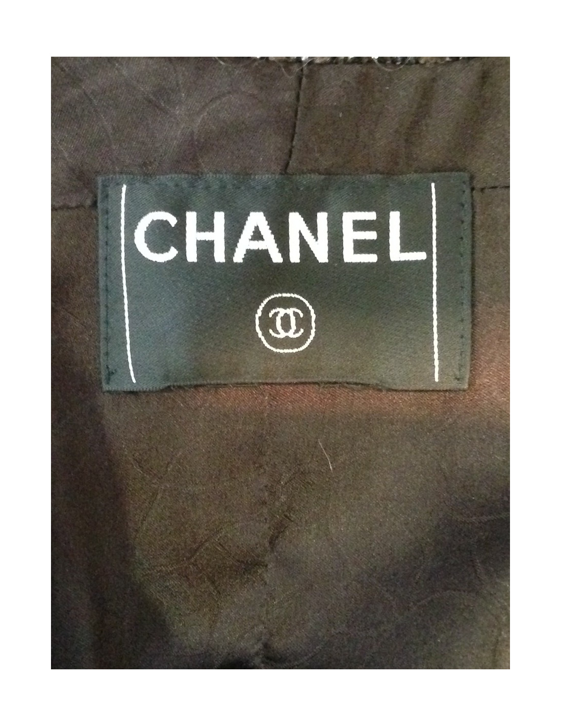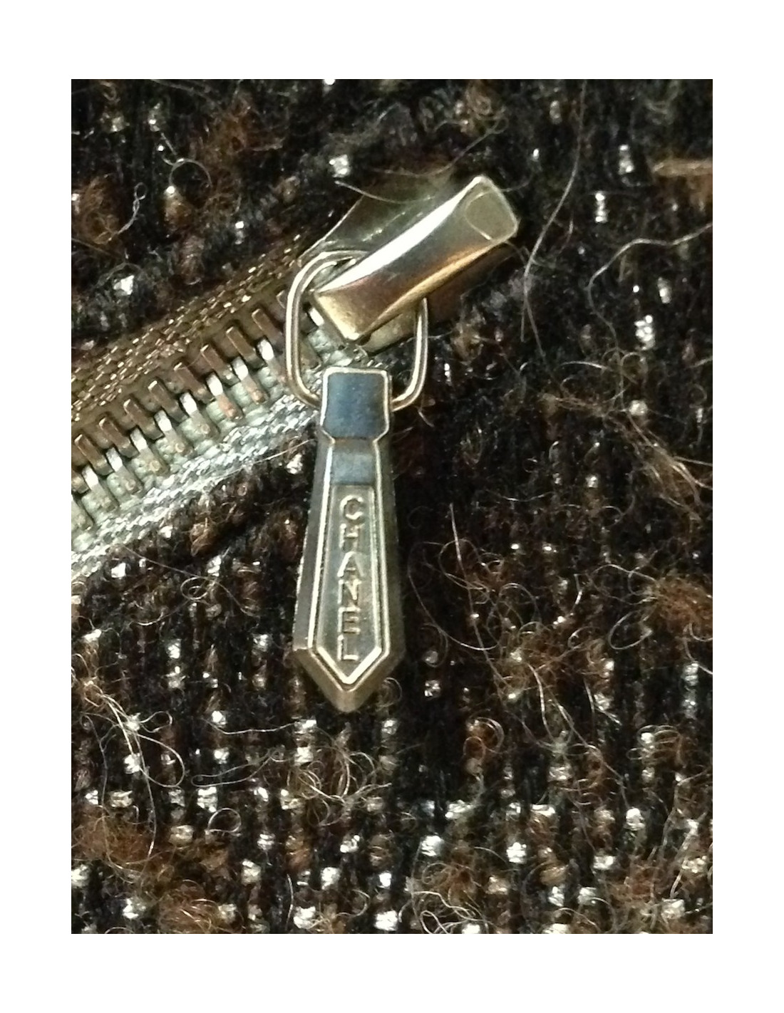 CHANEL jacket size 38 (no), lame tweed (acrylic and cotton) silver, Brown and black with lint. The lining is 100% silk monogrammee and ends with the famous silver chain.
