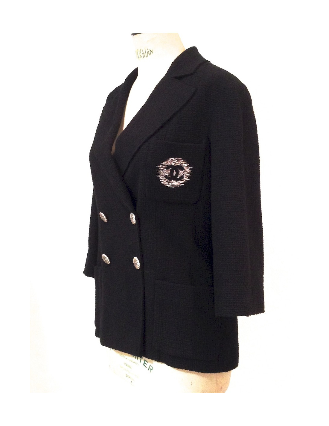 She is cross with double breasted silver. This article is in very good condition, le silver wire embroidered symbol "CC" is on the Pocket, which gives him a certain chic. Llining is silk 100% sealed of camellias. There's a chain Silver all around jacket.
