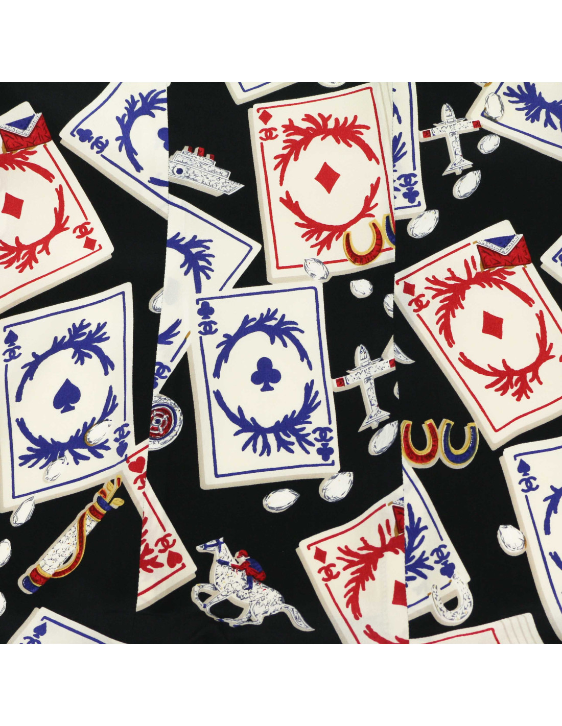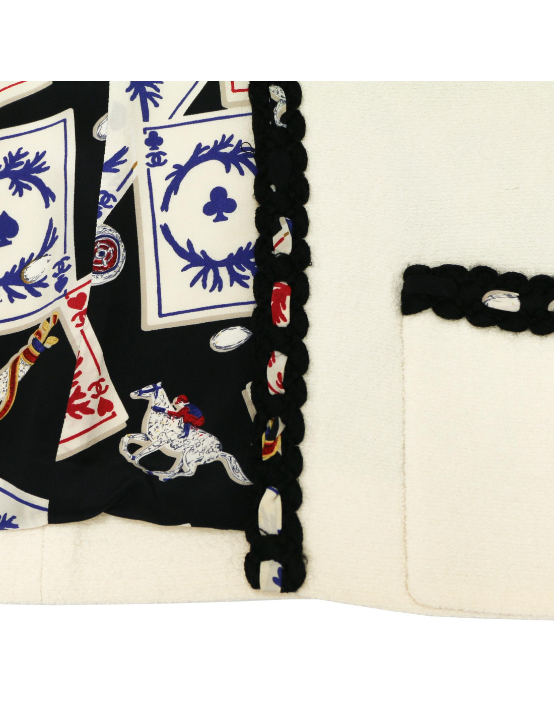 Details : Four-pocket jacket trimmed in black tweed woven with white, red and blue silk. The silk lining reminds us of card games. It's in very good condition on the outside, but the inner lining shows traces of yellowing around the neck due to age and a tear in the armpit area. We therefore place it in the "good condition" category.