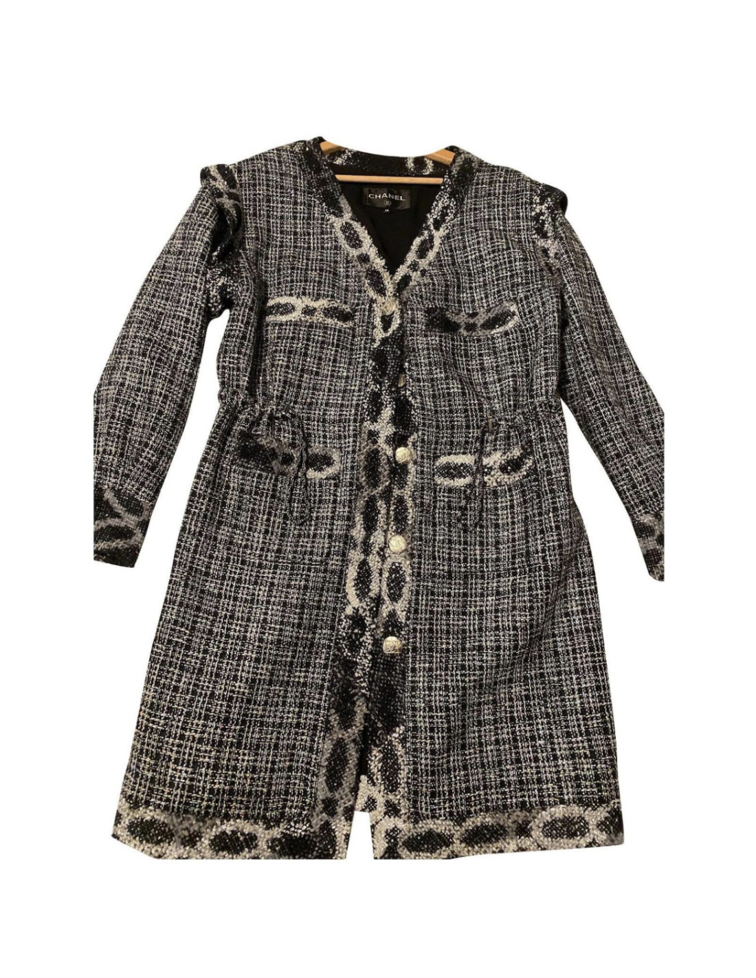 Last items in stock JACKETS CHANEL T40 jacket in brown tweed and black shiny threads CHANEL 22904 3,400.00 € Chanel jacket in brown, black and white tweed woven with black shiny threads. Size40 (no size tag). It is lined in brown monogram silk. Nice detail on the collar: it is entirely covered with black sequins. Each handle has 3 black buttons with pearl inlays. Dimensions flat: Shoulder width 40 cm, underarm 45 cm, total height 54 cm, sleeve length 62 cm. Will... Add to cart
