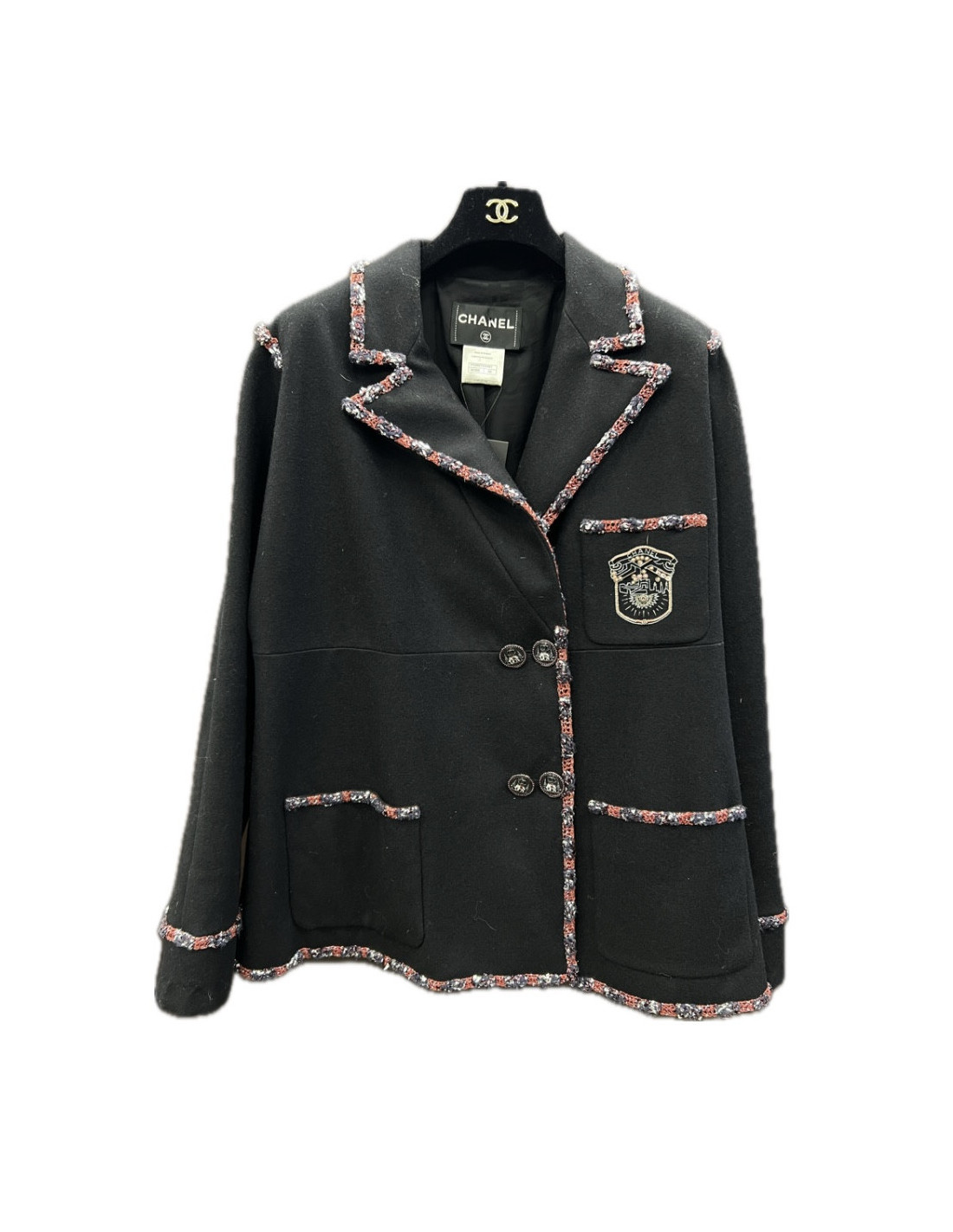 Last items in stock JACKETS CHANEL tweed jacket Size 46 FR CHANEL 33136 4,100.00 € Chanel black jacket Size 46 FR Condition : very goodMade in FranceSize : 46 FR (fits more like a 44FR)Materials : tweed, silkColors : black, white, green, blue, purpleButtons : green, silver, blackYear : Fall 2009 ready to wearMeasurements : shoulders: 42 cm, underbust: 56 cm, height: 64 cm, sleeve length: 52 cm, wrist: 30 cmDetails: black silk monogram... Add to cart