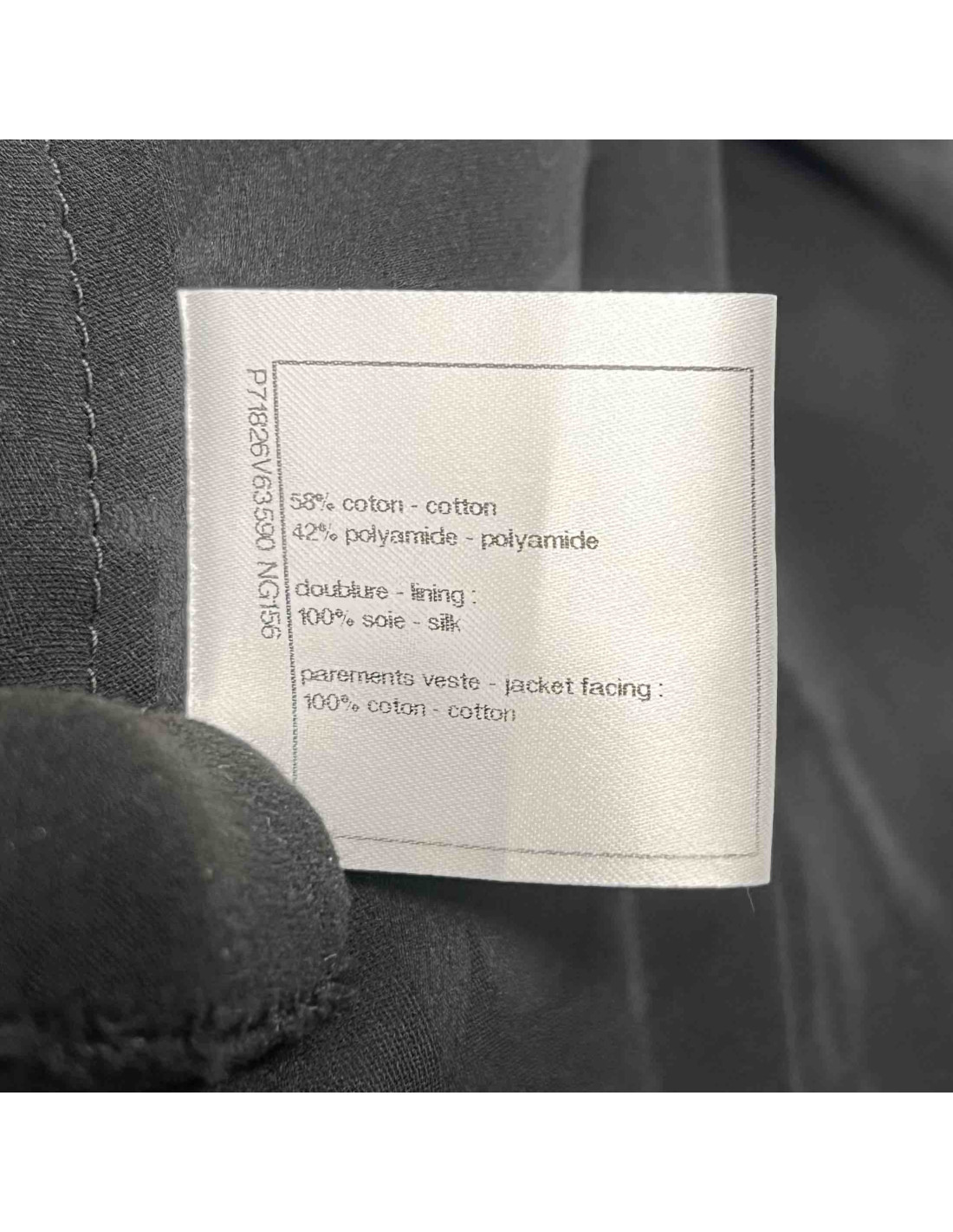 Last items in stock JACKETS Chanel T 36 fr "Les fonds marins" jacket in green cotton tweed CHANEL 19977 1,800.00 € Very beautiful Chanel jacket in green cotton tweed from the Collection 'Les Fonds Marins' Spring-Summer 2012. It has a black liseret and closes with 6 buttons in hammered metal resin anthracite with CC logo. The lining is in the green water silk with Camellias pattern, CC and Chanel signature. In very good condition. Size 36FR Dimensions flat: shoulder... Add to cart