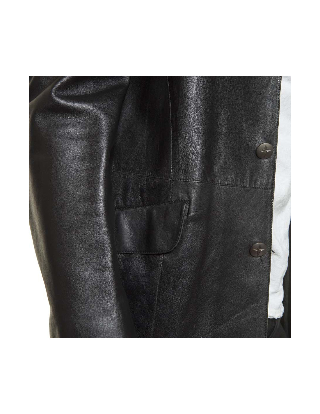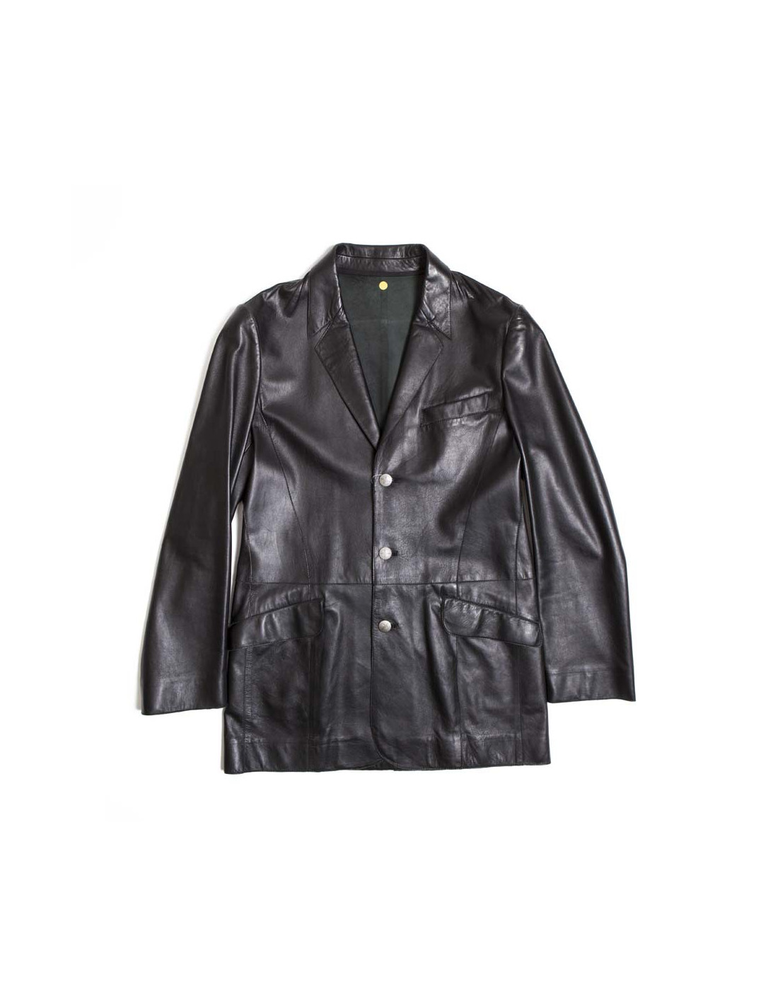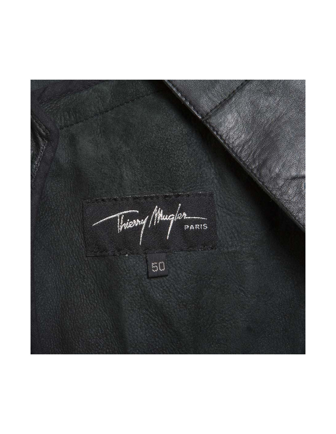 Vintage. Veste longue Taille 50 Thierry Mugler homme, en cuir d'agneau 100% souple lisse noir, col à pointes surpiquées, coupe cintrée, fente au dos en bas, 3 boutons argent vieilli mat siglés du logo de la marque "l'étoile", pochette à la poitrine et poches à rabats en biais sur les hanches. Flat dimensions: length 76 cm, < sPan style = "make - family:Arial; are - size:12px; do-style: normal;" >Length of sleeve 64 cm, poignet30 cm Tower, Width 50 cm, c chestarrure: 46 cm