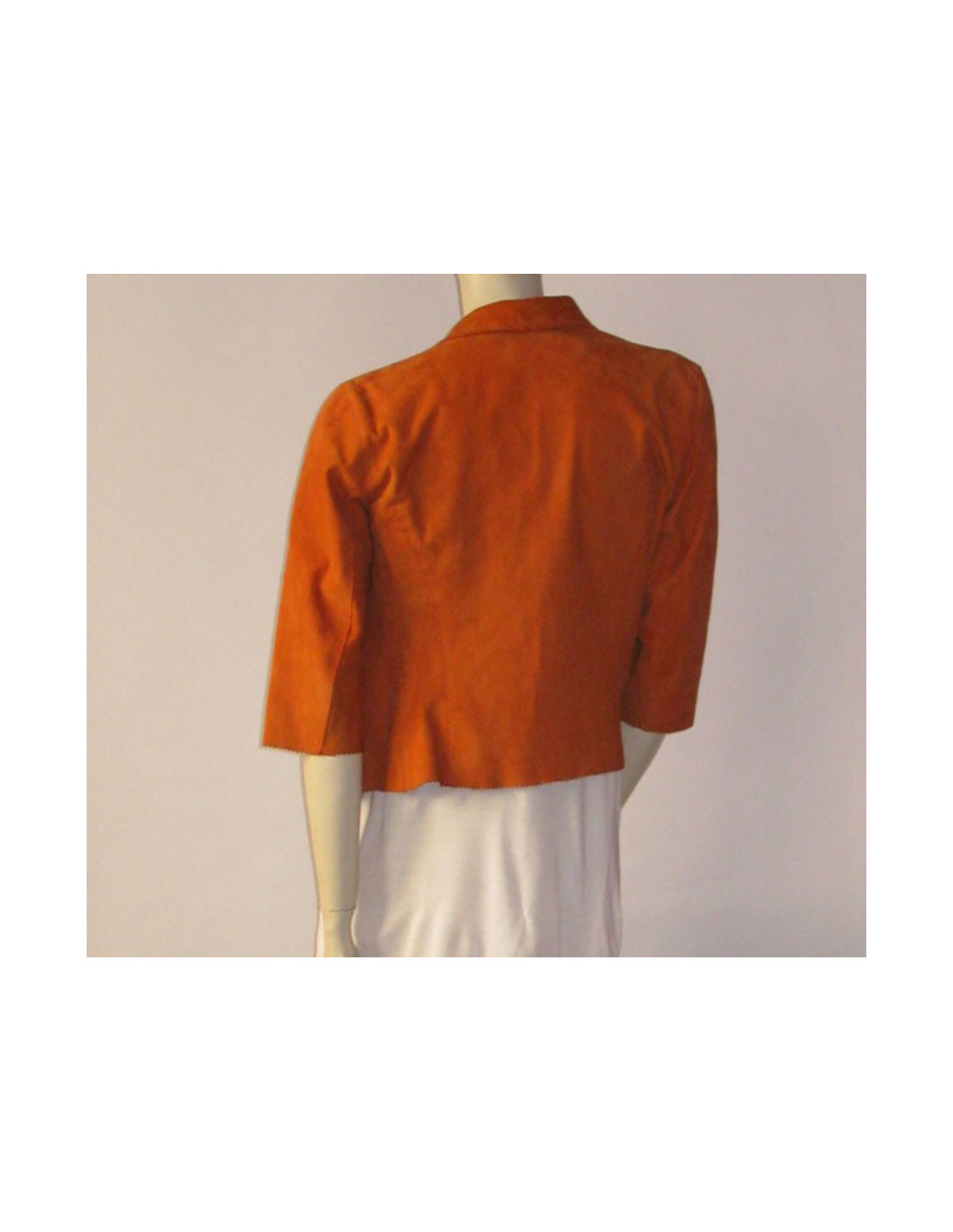 Small jacket MISSONI T38FR Suede, color tangerine, collar shirt, sleeve 3/4, line adjusted. Pretty geometric details on the collar on front closure Strip, 4 buttons, clips of bending, at the bottom of jacket and sleeves. 100% Suede (leather goat). Collection: Spring/summer Color: Tangerine Length: 49 cm, Chest width: 45 cm Length of sleeves: 42 cm, Build: 38 cm Slight task to pass due to wearing the jacket