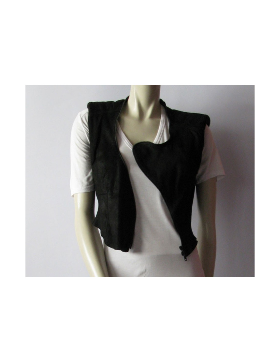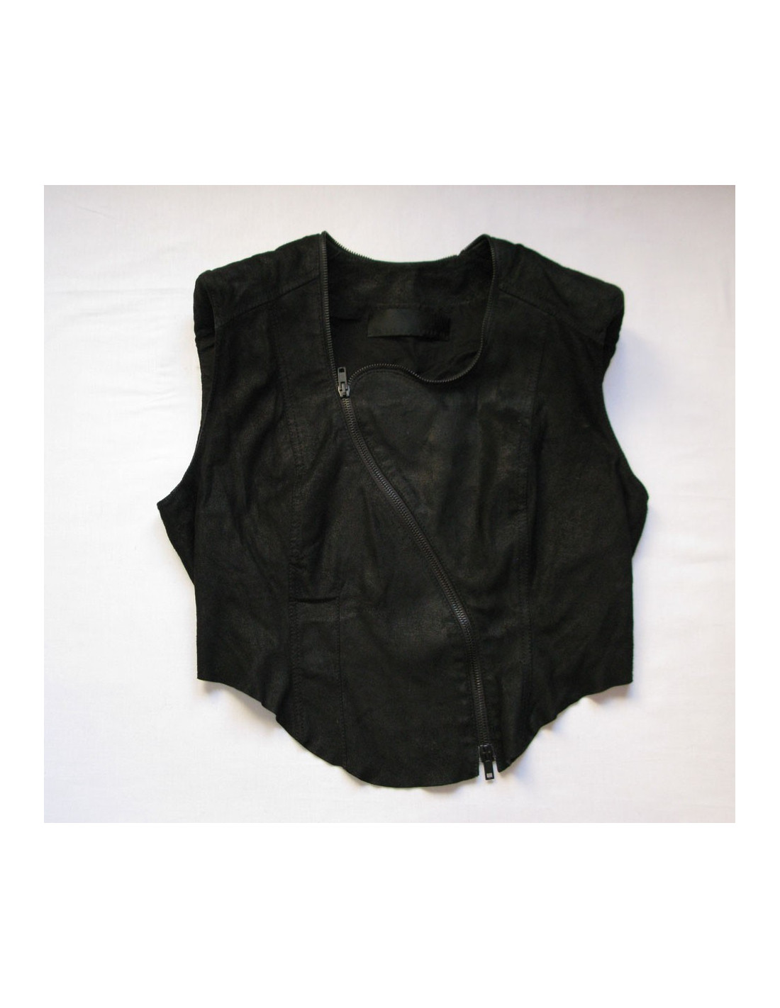 Superb short jacket Haider Ackermann T40IT (or 38FR), soft black washed leather, without sleeves, small-shouldered, wrinkled effect. Circular zip running along the neck to the front closure.