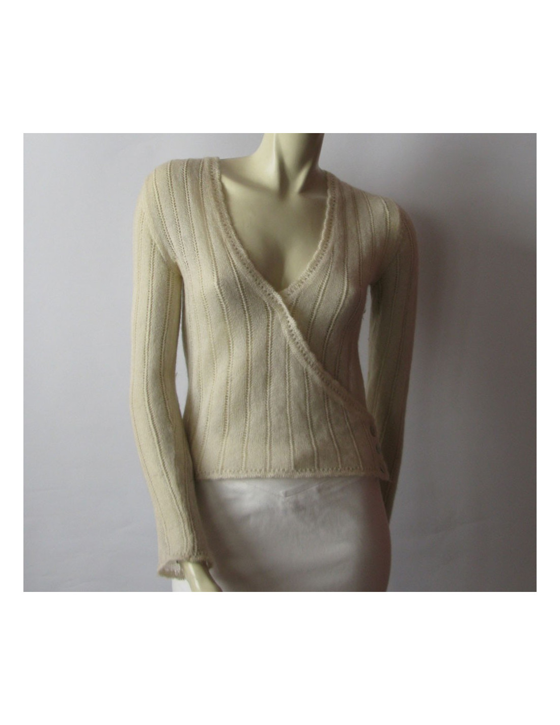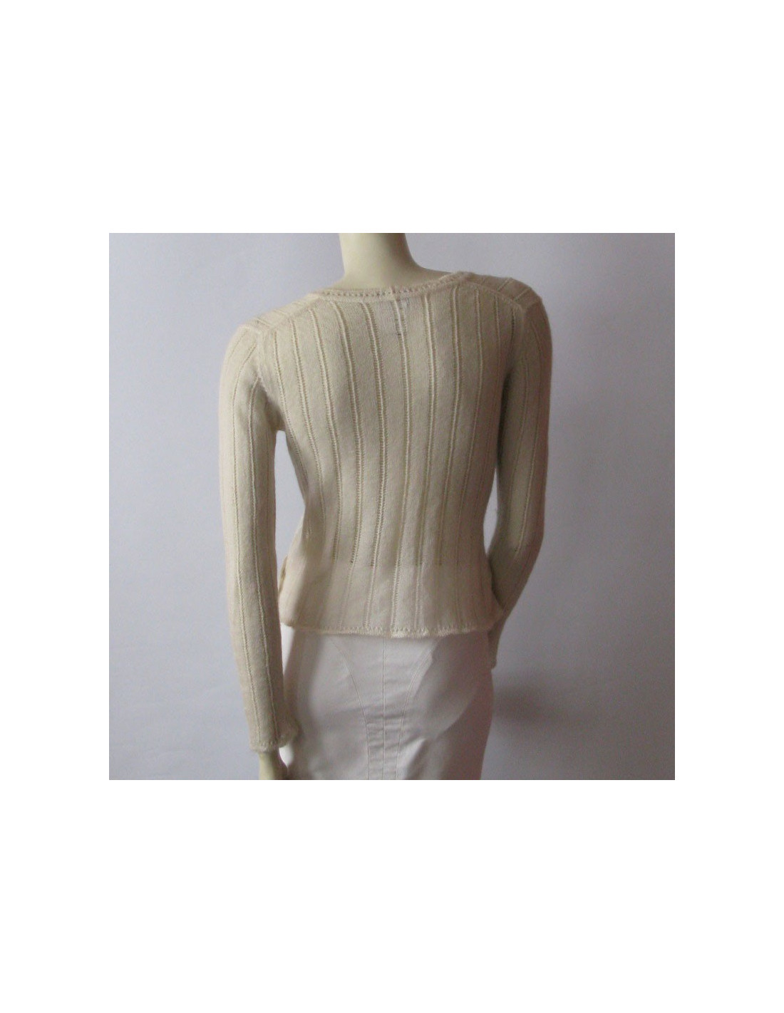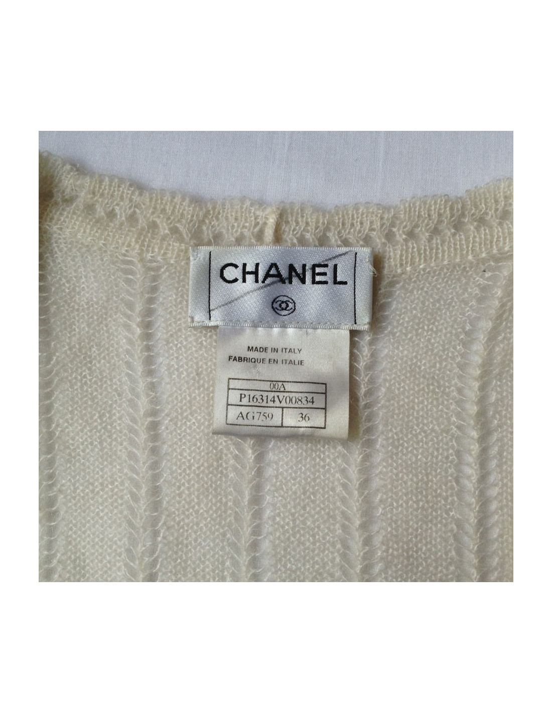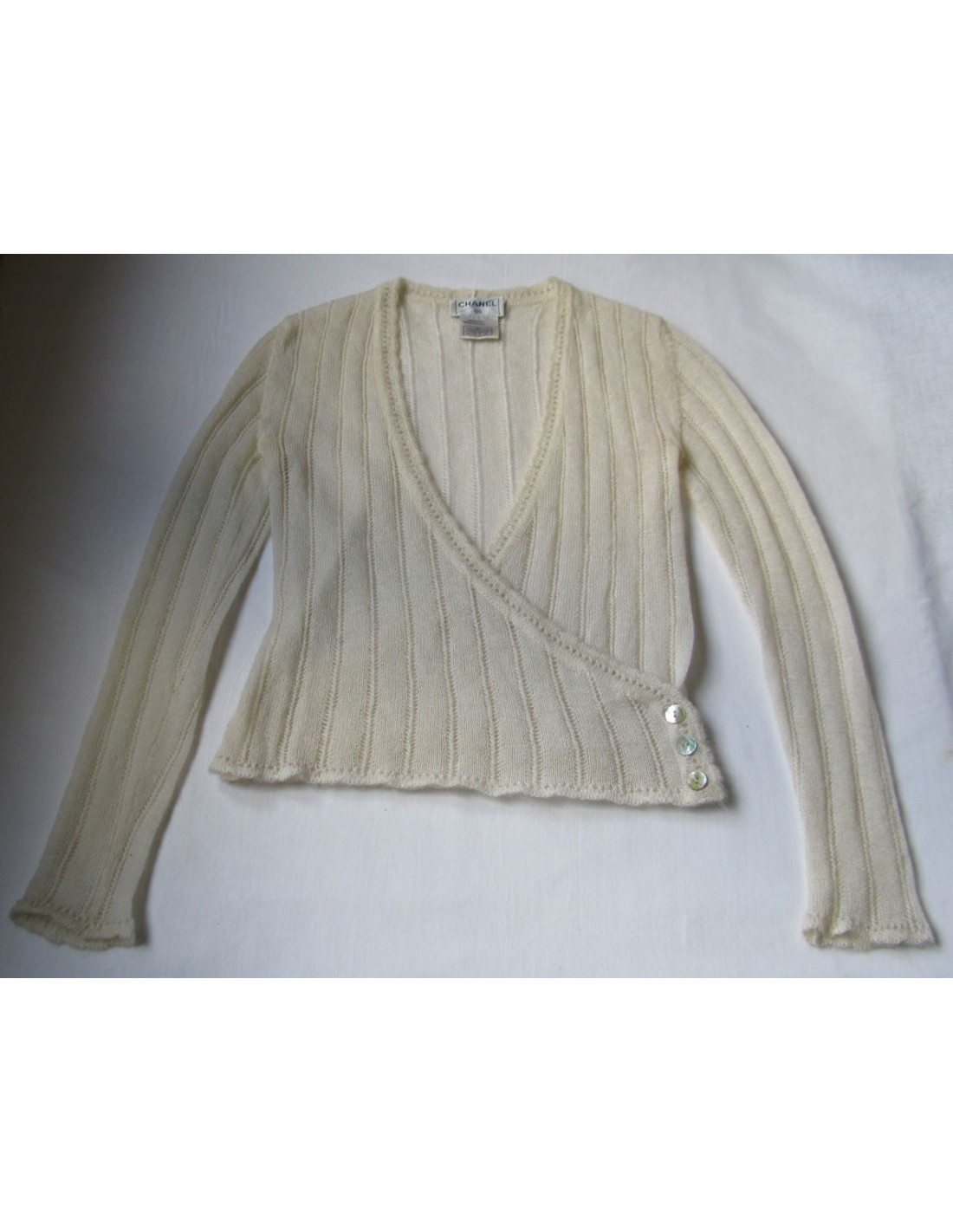 Cache heart CHANEL off-white T36Fr, hand "knitted" effect, neckline V, long sleeves. Closing on the left side by 3 pretty serious Pearly buttons "Chanel Paris". 65% mohair, 35% polyamide. Collection: Autumn 2000 Color: off-white Length: 49 cm, Chest width: 39 cm Length of sleeves: 62 cm, Build: 36 cm the "Chanel" brand label is barred in black marker.