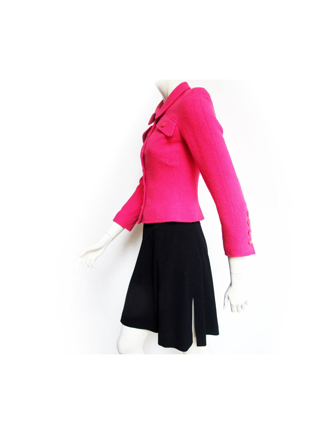 All CHANEL t 36 fuchsia and black. The Fuchsia jacket is 100% cotton. The buttons are acronyms CC gold metal. The lining is silk. In very good condition. Height: 54 cm, back width: 36 cm, sleeve length: 55 cm, width at the level of the chest: 36 cm, width size: 36 cm, width at the bottom of the jacket: 39 cm The black skirt is made of 100% wool. The lining is silk. Size 36. The size, there is a way corset frame. It closes in the back of a zip. A small slit of 19 cm from each side of the skirt. Height: 52 cm, width at the waist: 29cm, hips: 44 cm, width at the bottom of the skirt: 65 cm will be delivered in a Chanel bag