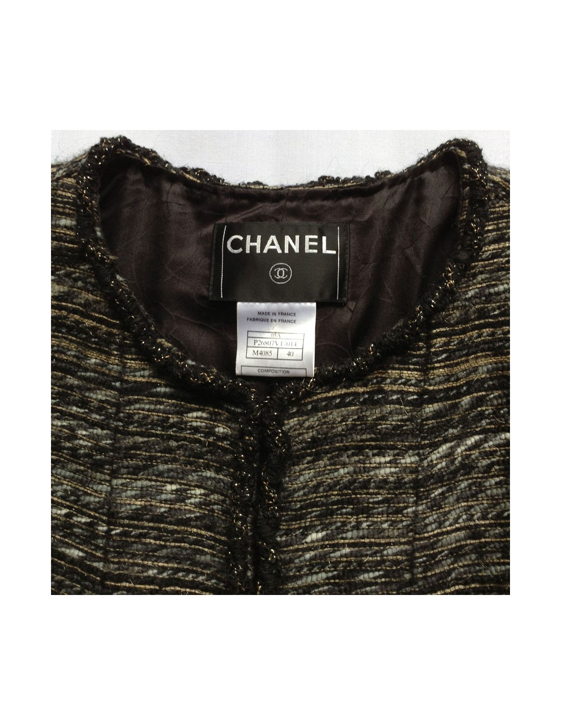 Divine! CHANEL multicolor tweed jacket: black, anthracite, blue and gold. Straight cut, ras neck collar, long sleeves. Closing buttoned at the wrists by 3 beautiful buttons acronyms CC with the fabric of the jacket. The col, the edge of the wrists, the pockets on the sides in large "L"-shaped, the Center and the bottom of the jacket are looped to a mat of Black wool with son '' or ''. Opening front by 5 hooks. Size 40fr - wool.