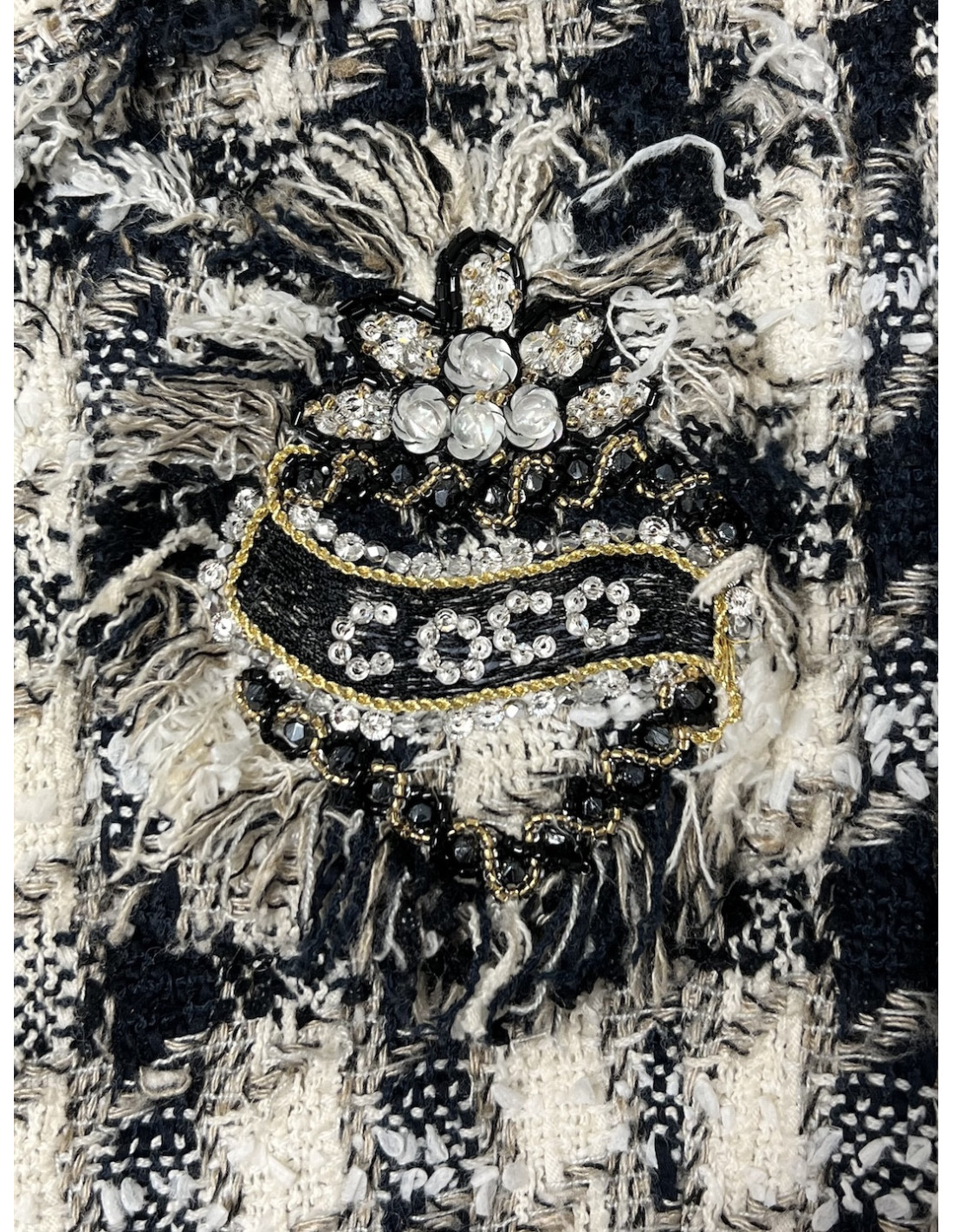 Details: Delightful tweed jacket embellished with CHANEL brand symbols.