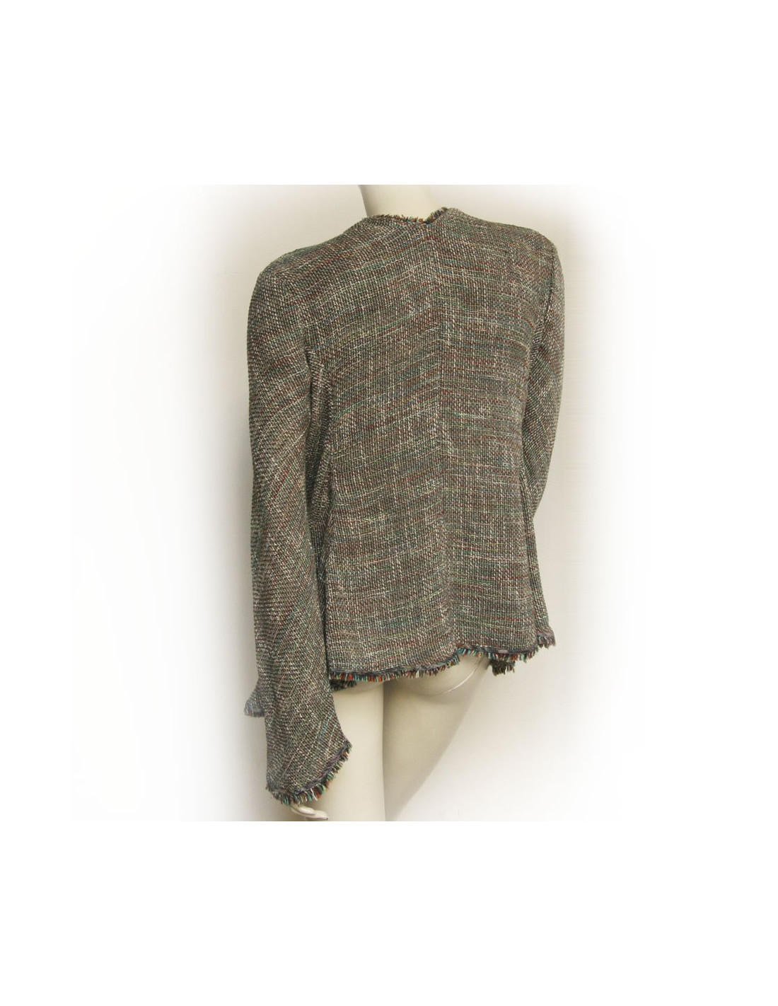 Jacket Theyskens' theory T42 in cotton and multicolored acrylic. Two pockets at an angle at the front. Multicolored fringes on the pockets, down and all around it. It is open. In very good condition.