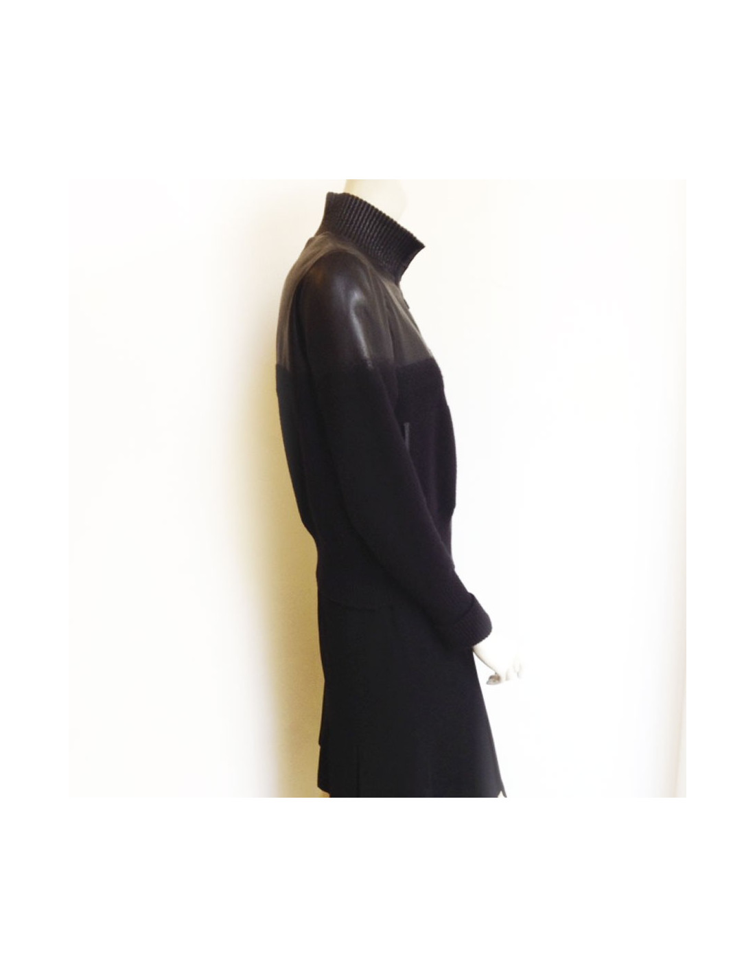 Chanel jacket in wool and lambskin black T40. Two patch pockets at the waist. It is tightened at the waist. It bears the initials CC on the left shoulder. In very good condition. It has a small tear under the right arm, see picture.