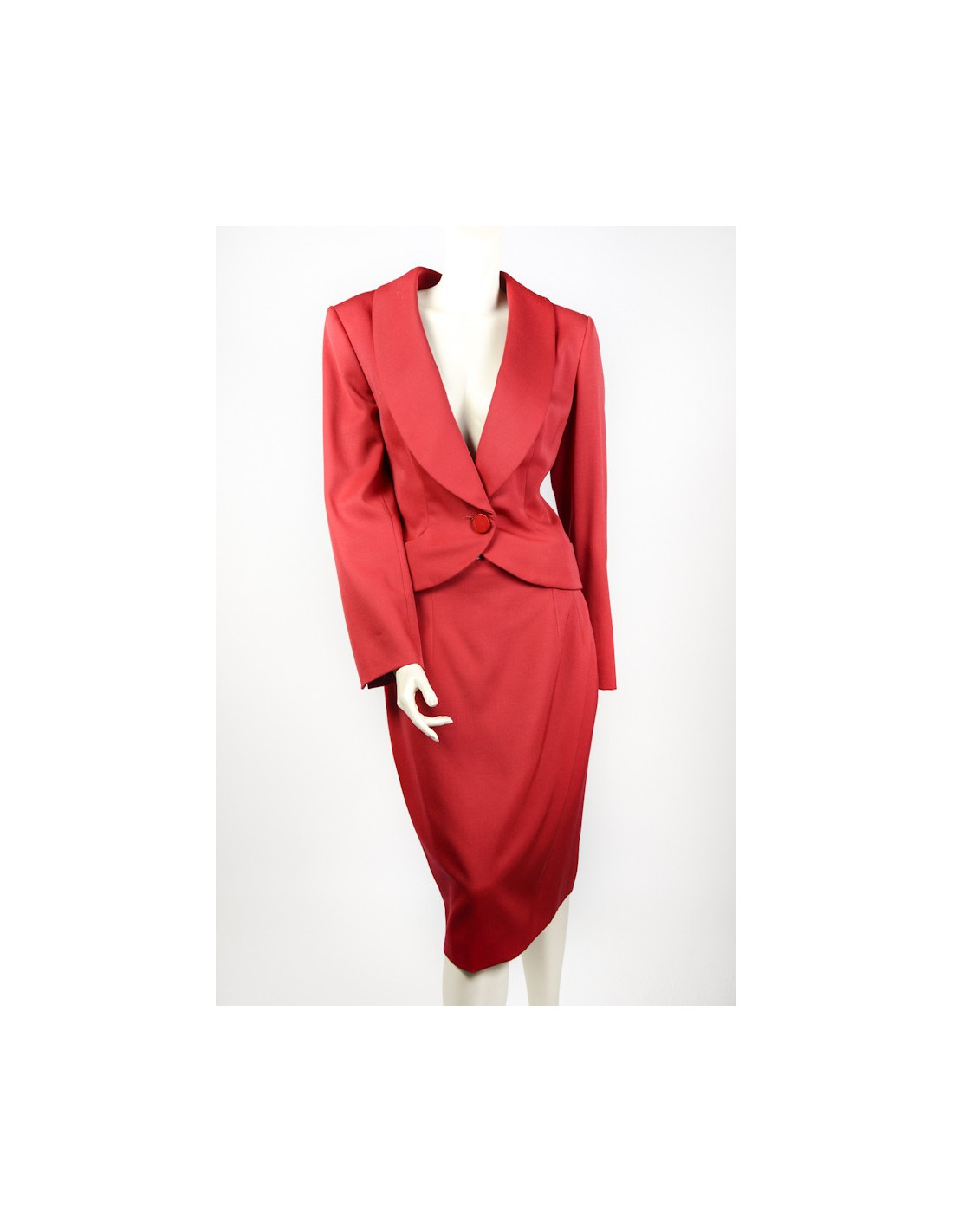 Very chic! A skirt and jacket suit store Christian Dior with a removable red mink collar. No size tag. In very good condition. Size 44. The jacket has 2 pockets on the front. Two slots on the sleeves, allowing them back. 1-button closure. Silk lining. Height: 59 cm, back width: 44 cm, chest width: 50 cm, sleeve length: 62 cm The skirt has a slot on the back. Zipper at the back. Height: 63 cm, width height: 40 cm, hips width: 53 cm, bottom width: 49 cm