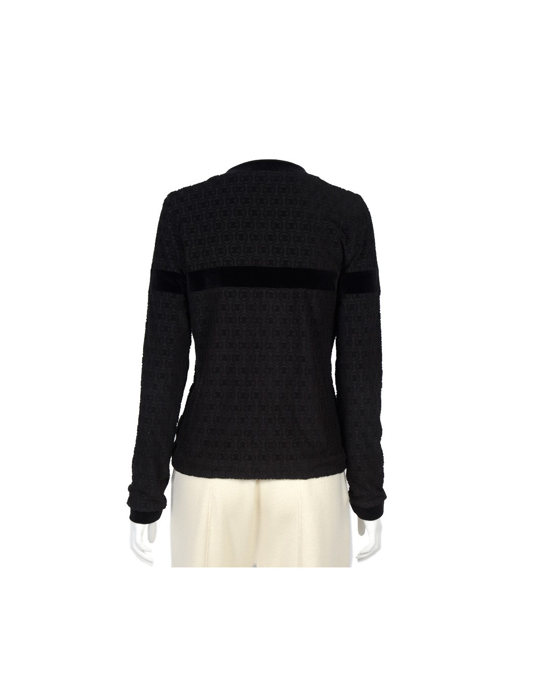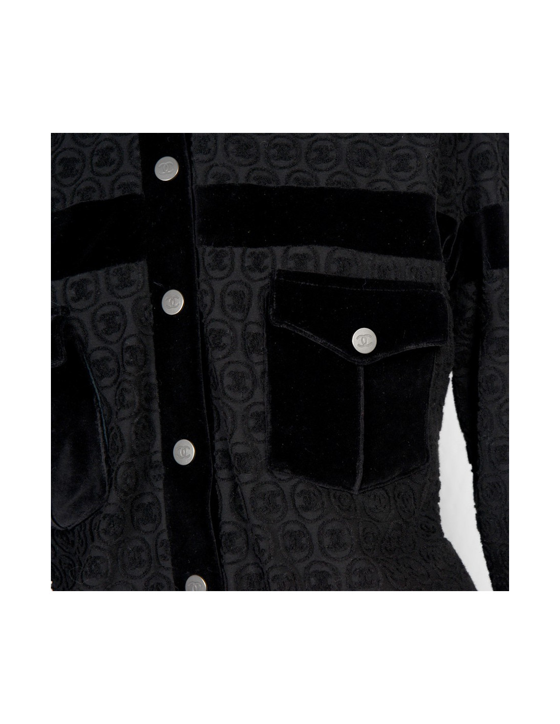 Black cotton jacket Chanel stretch. Very convenient to carry in a sportswear, reasons sponges monogram double 'C' style. Size 42 Italian is equivalent to a 38 french. Pockets and edges are in velvet. The buttons are silver-coloured metal with the "CC" logo in the Center. The lining is cotton. In very good condition.