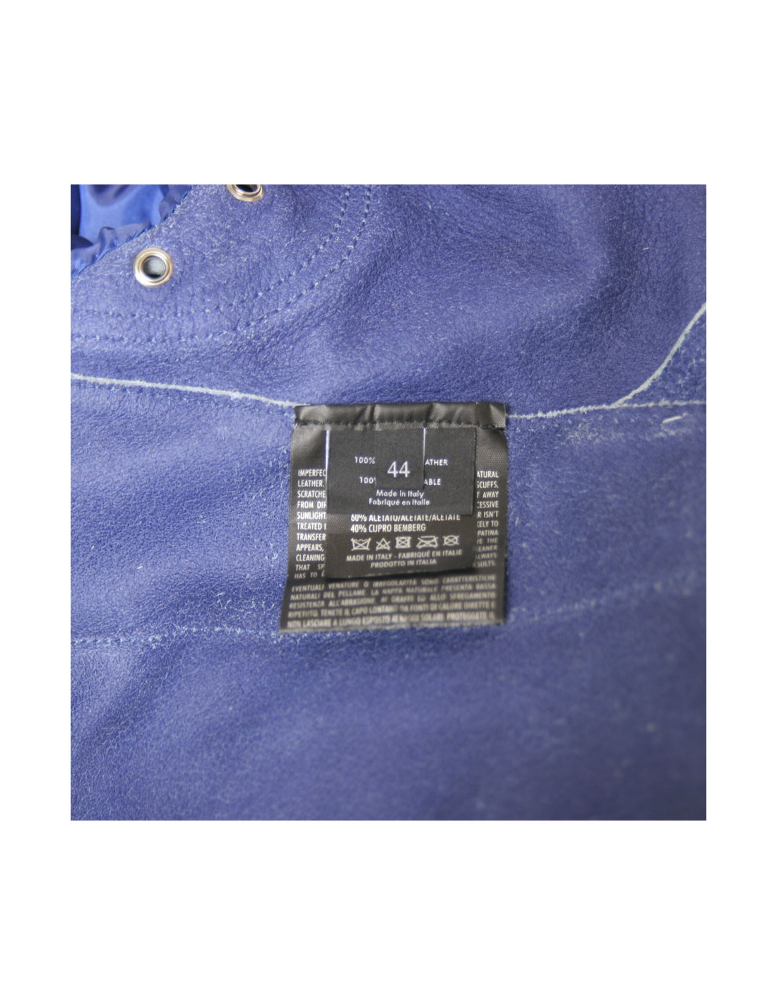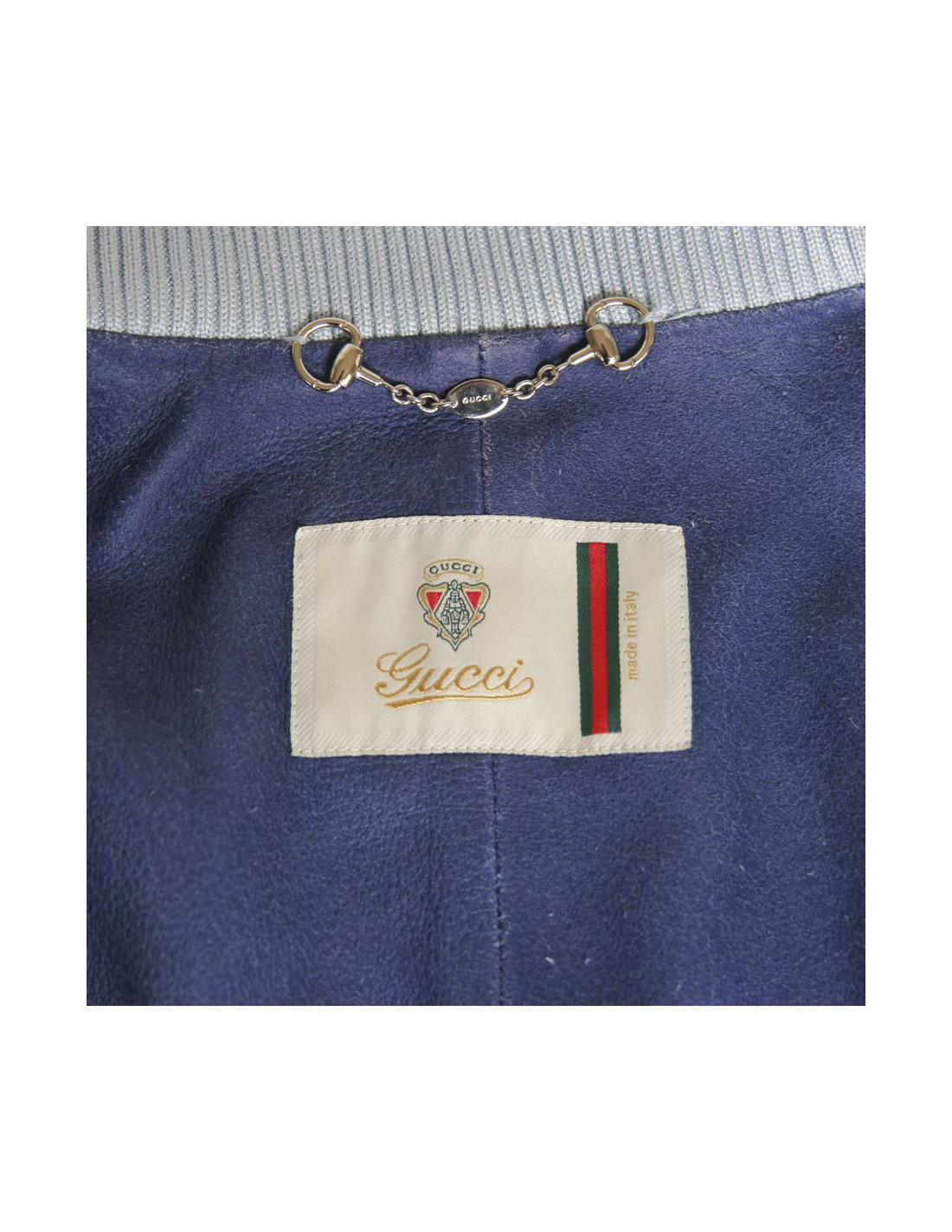 Sky blue Gucci leather jacket. Size 44 Italian is equivalent to a 40 french. Zipper closure. Two zipped front pockets. Ceintree. Closing pressure down and up to the cervix. Col stretch cotton. In very good condition. Small patch on the right sleeve.