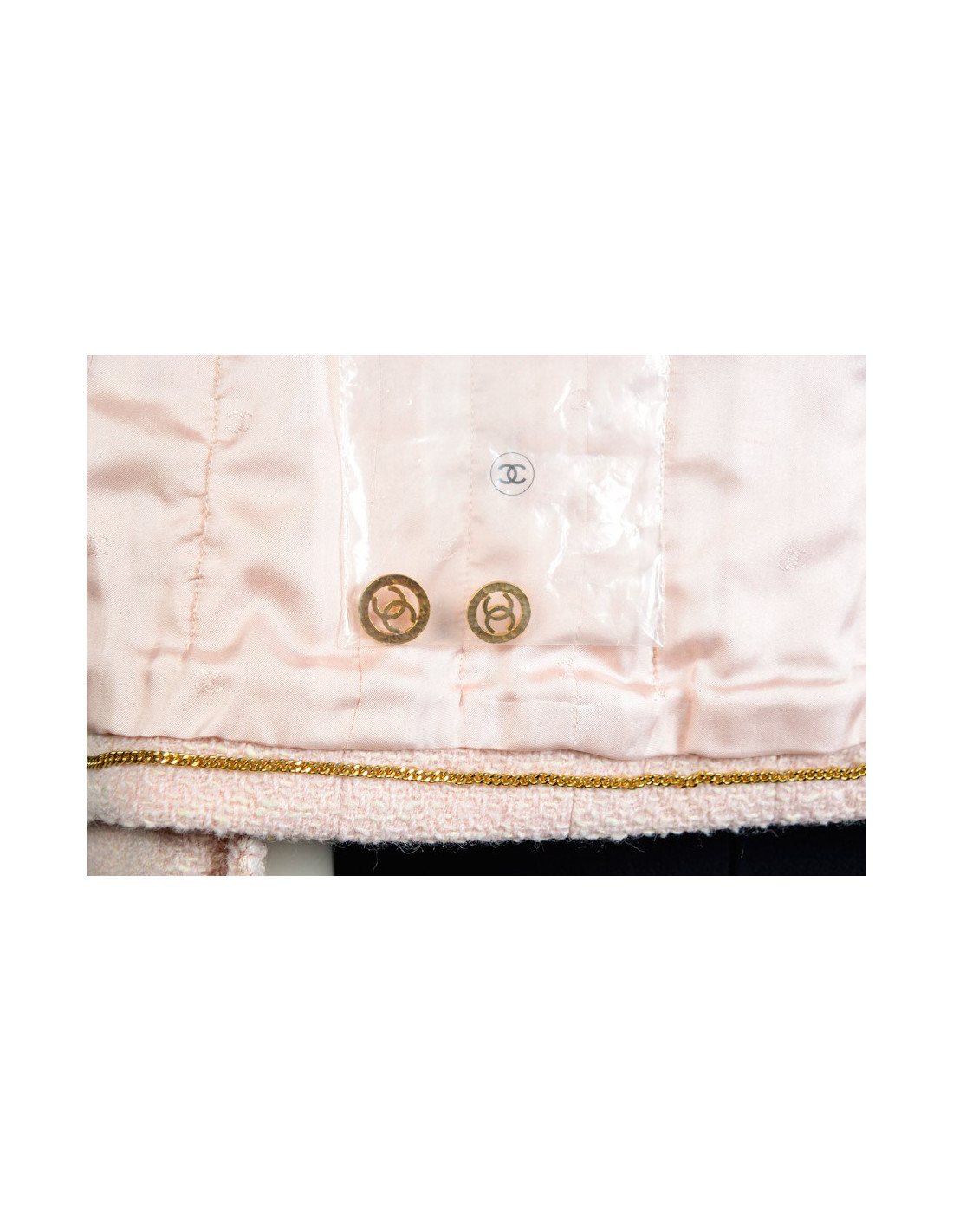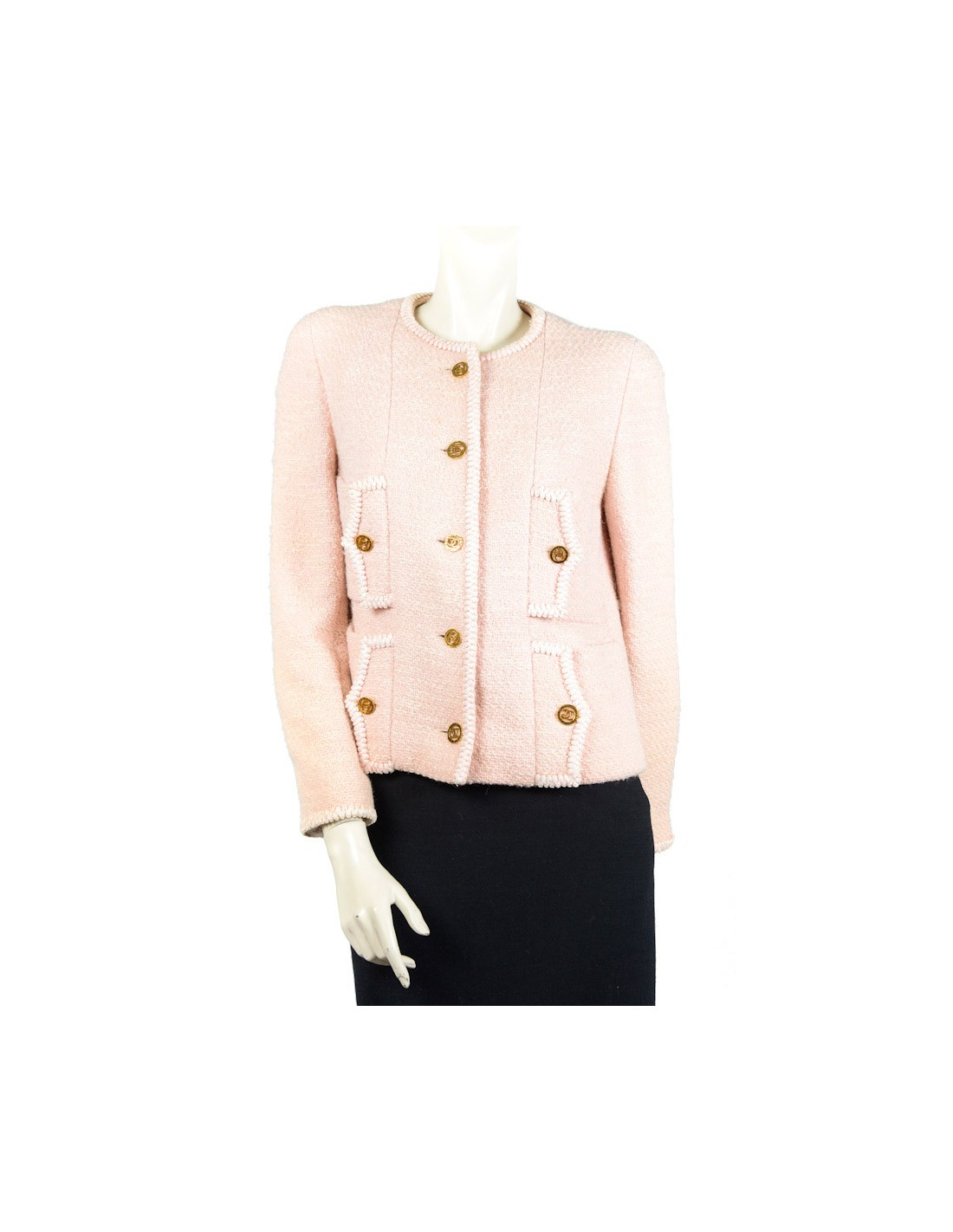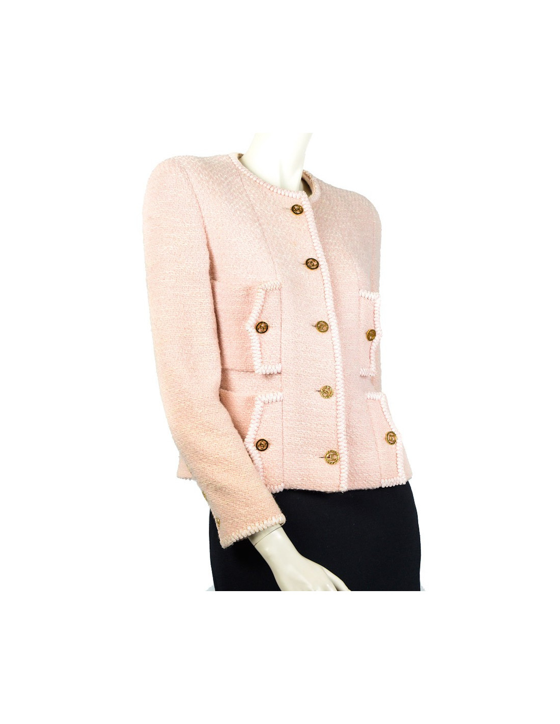 Pink Chanel tweed jacket. Size 40. Closing 5 gold sewing buttons initials "CC". 4 pockets side buttoned. 2 buttons will be additionally provided with the jacket. No size tag. In very good condition.