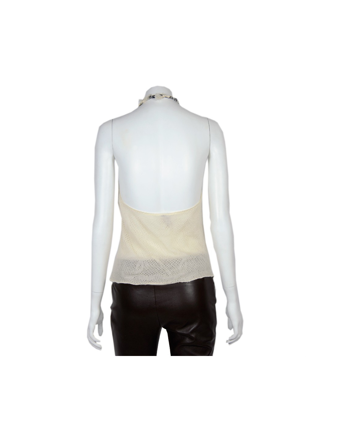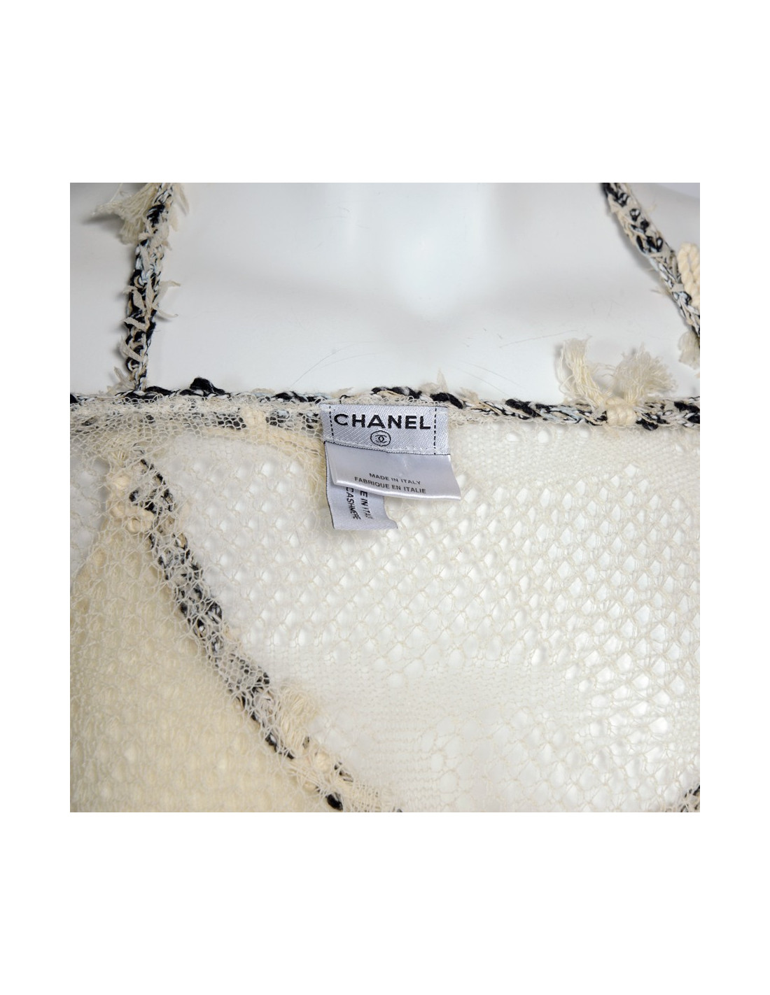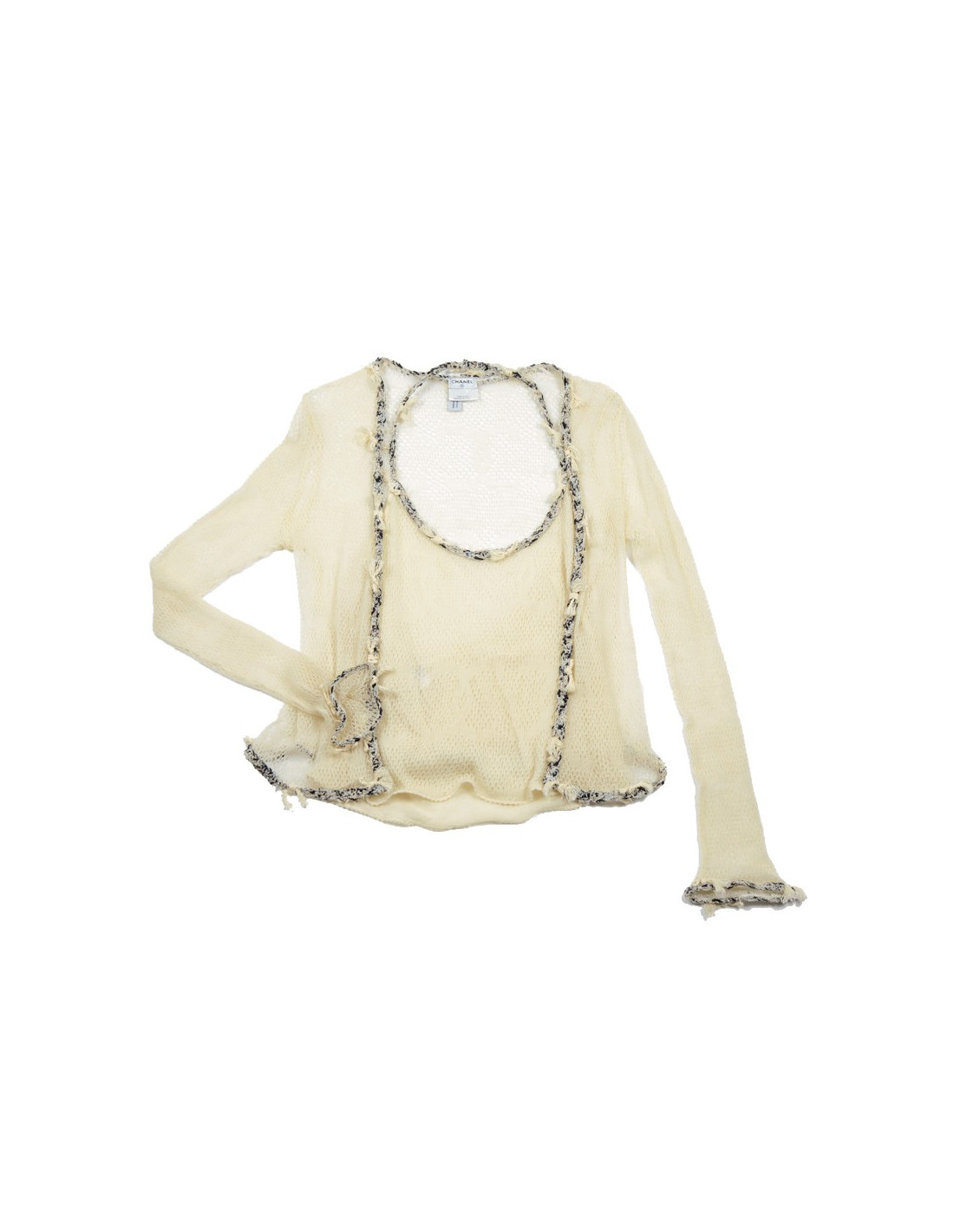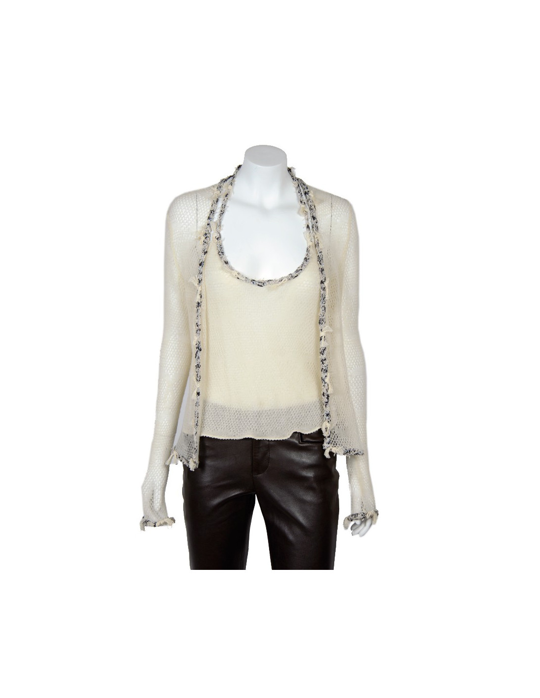 Twin set Chanel knit color cream. T40. Twin set mesh very fine and delicate beige. Edge twist tweed Cardigan. Wide mesh as a hook. Top bare back with the same edge as the sweater. High double mesh. No button or Pocket. Very good condition.