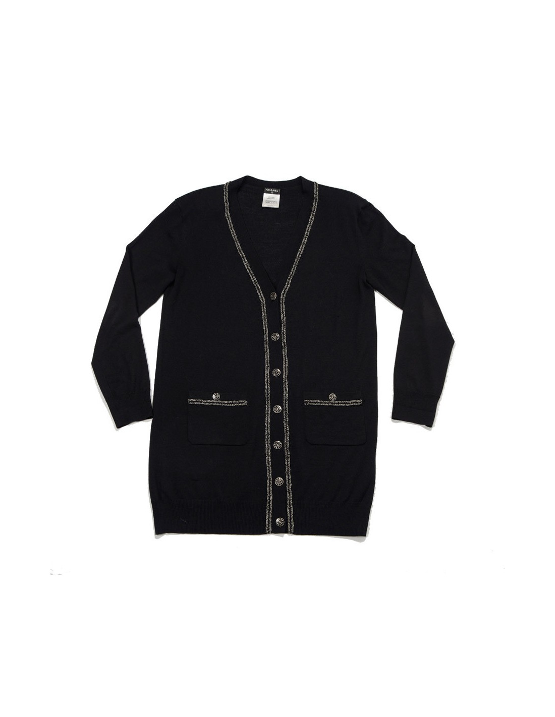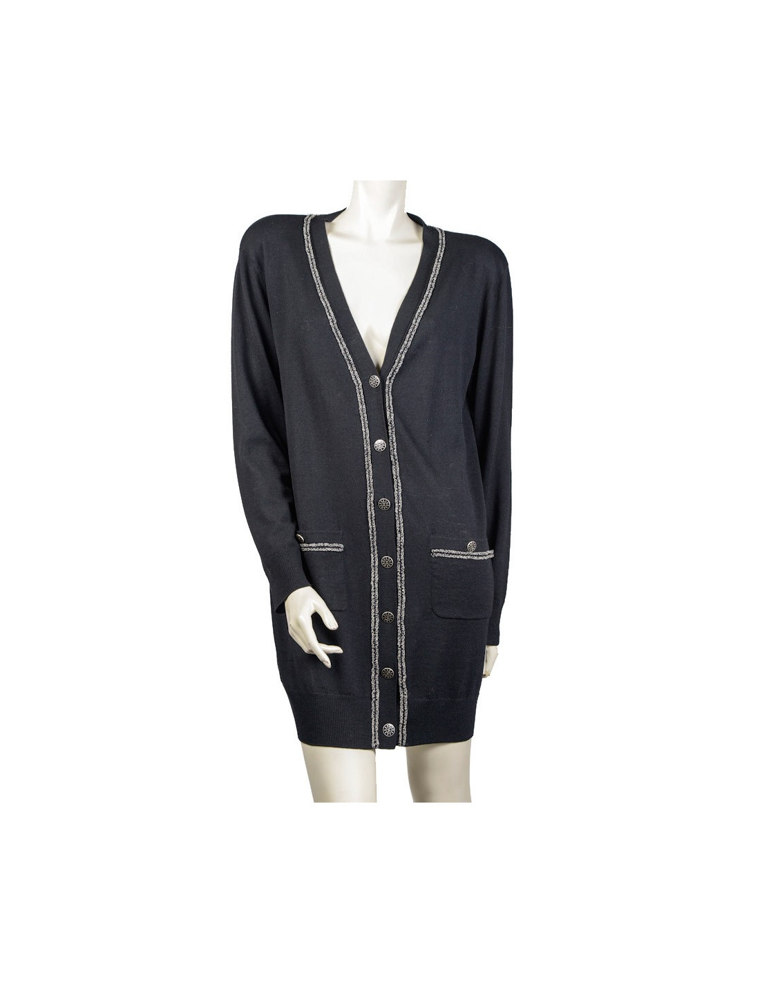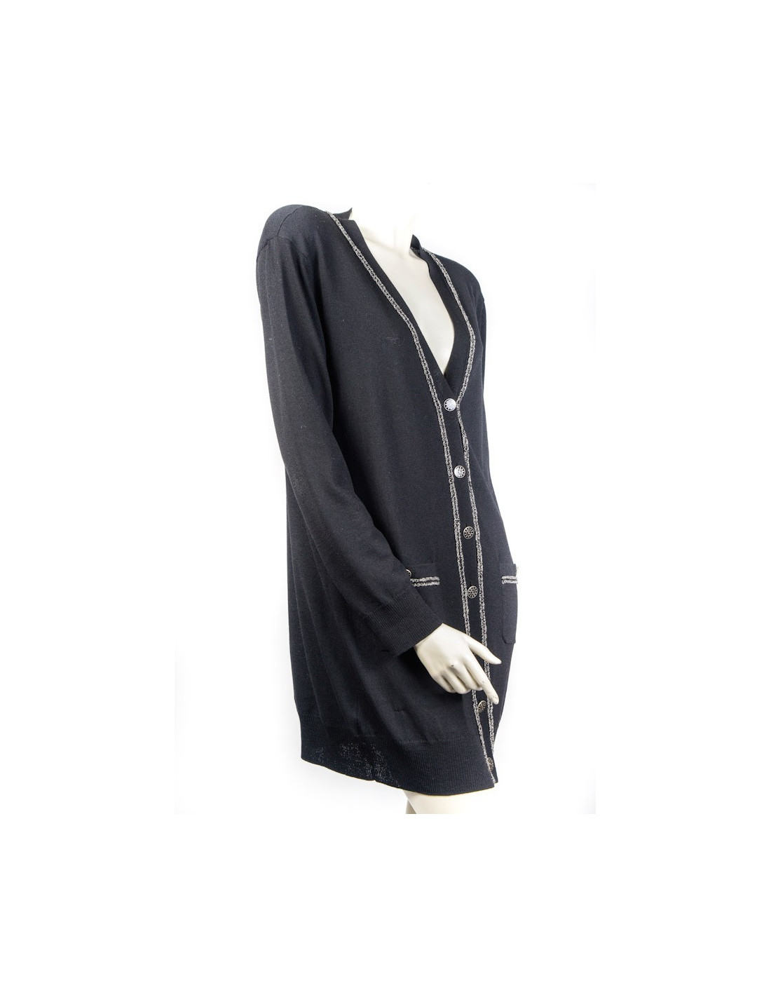 Long black jacket in wool iconic of the House of Chanel, with black and white trimmings. Size 40. Current collection. Retractable shoulder pads. In very good condition.