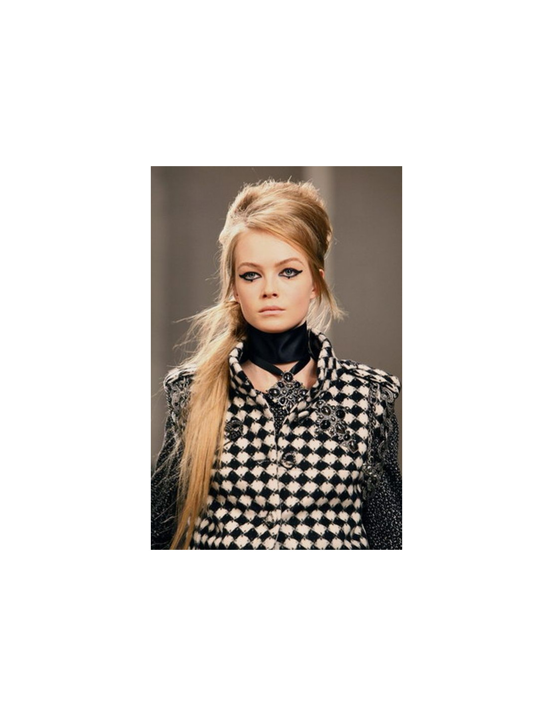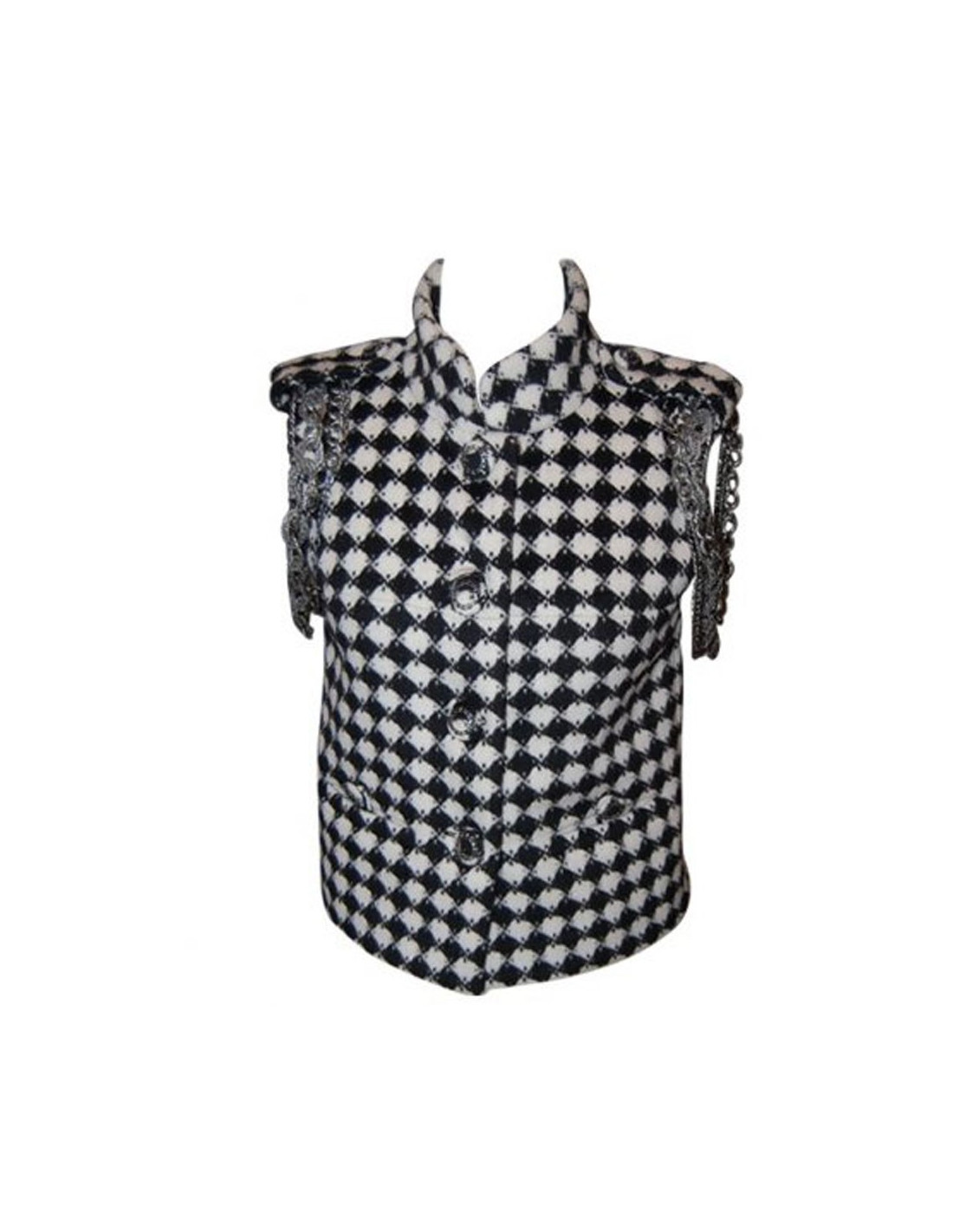 Great jacket without sleeves, from the Paris Collection - London CHANEL. This jacket is adorned with chains in different tailles(breloques CC pendantes) ruthenium, falling on shoulders (Look very rock), a beautiful black jewelry buttons, and pattern (tissue) is a big black & white chicken foot. The neck is soaring. Coin collector