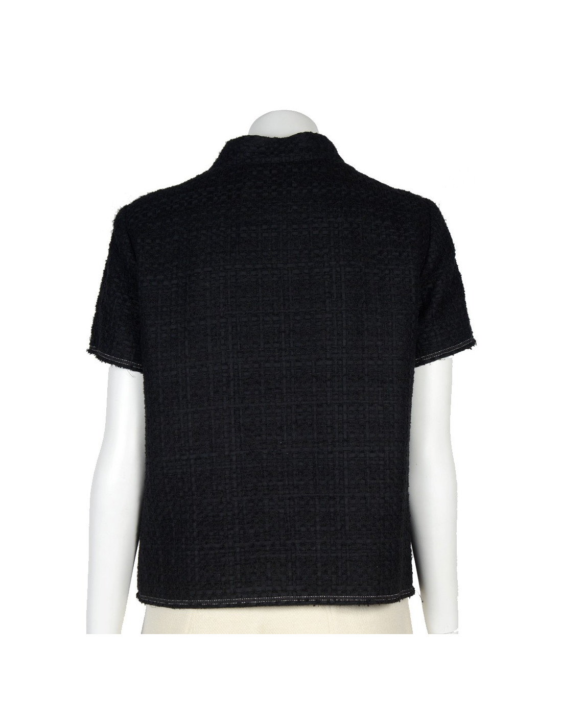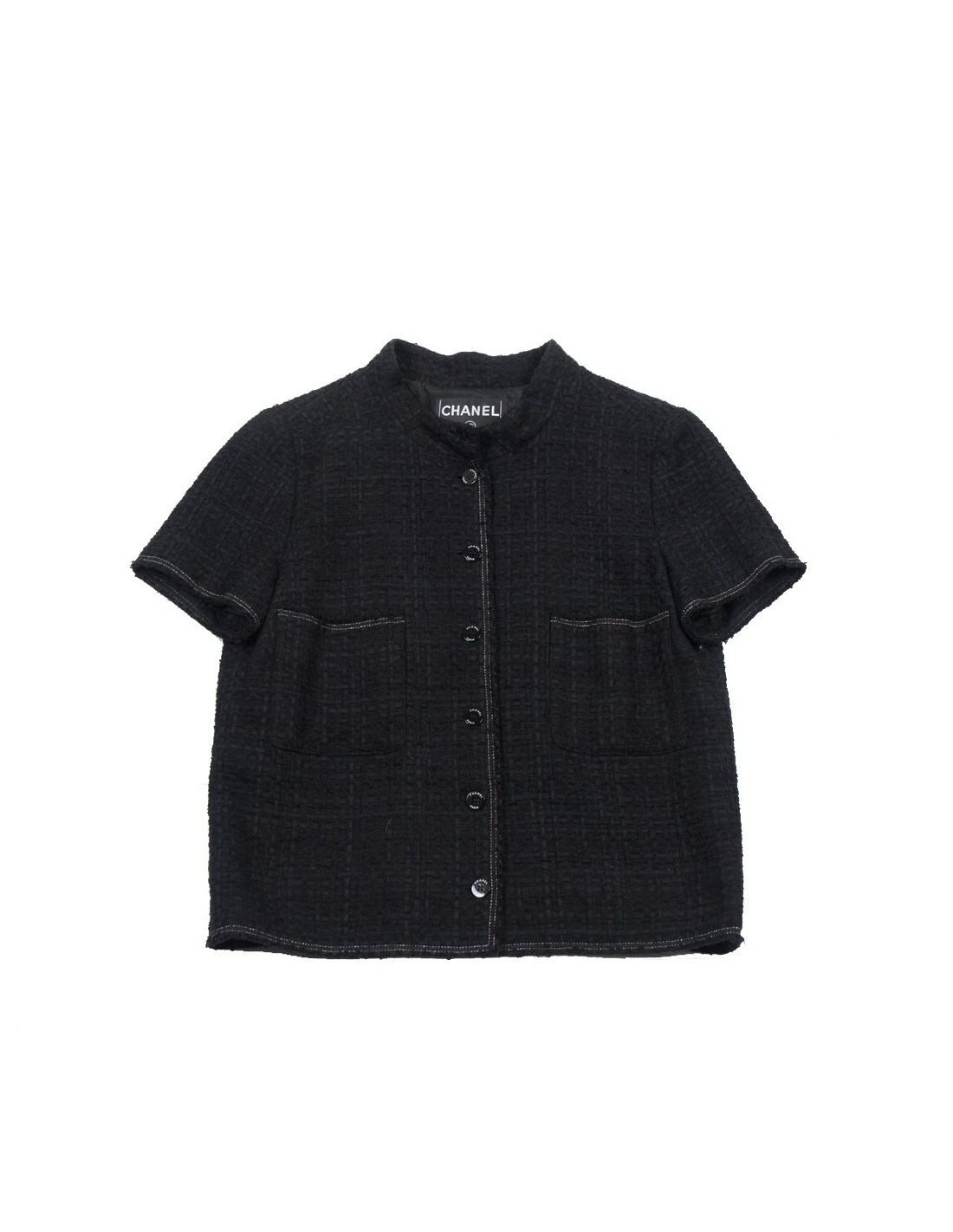 Black tweed jacket Chanel. No size tag is equivalent to a 38. Jacket with short sleeves and collar mao. Two front pockets. Closing front buttonhole. Interior lining black silk. Very good condition.