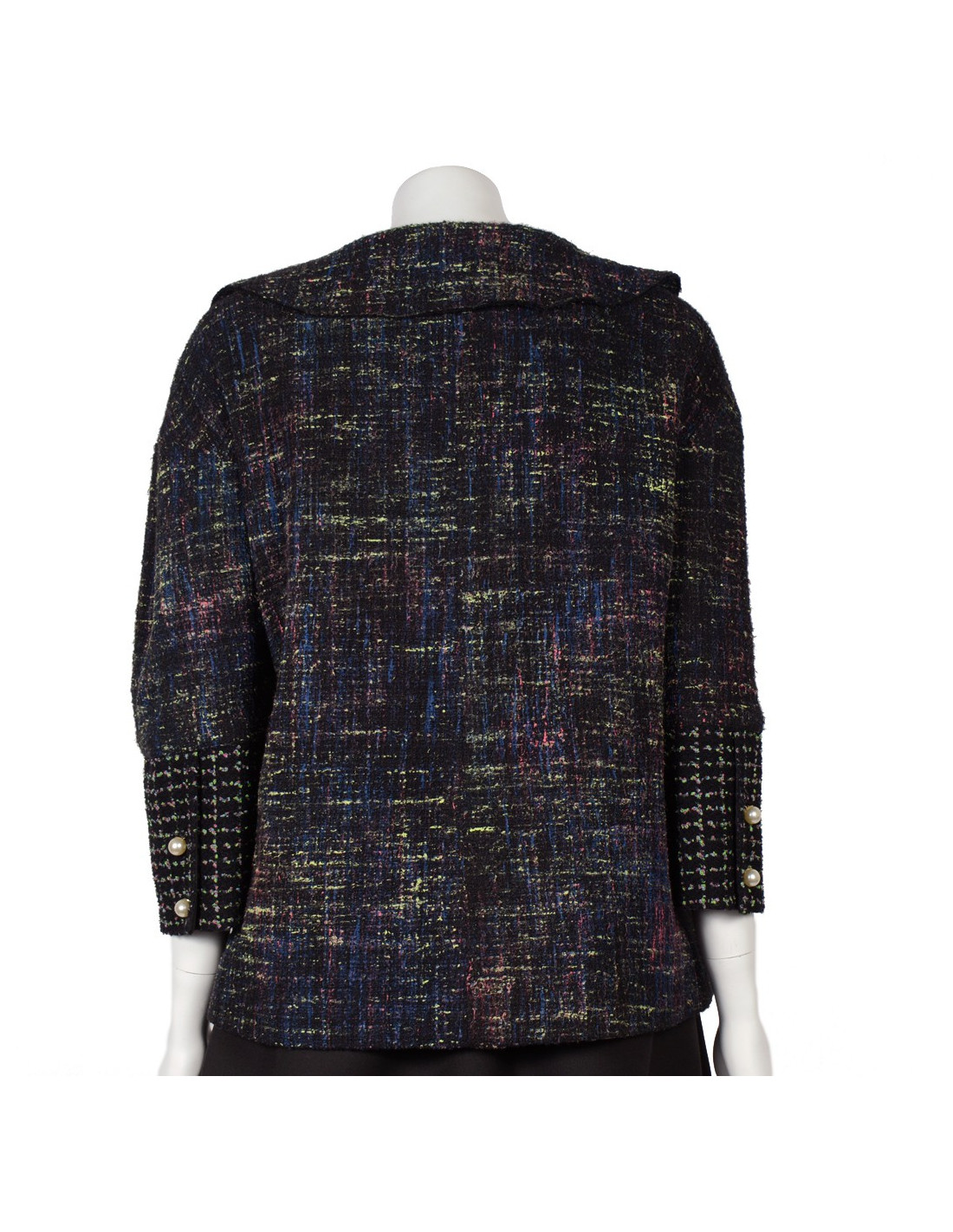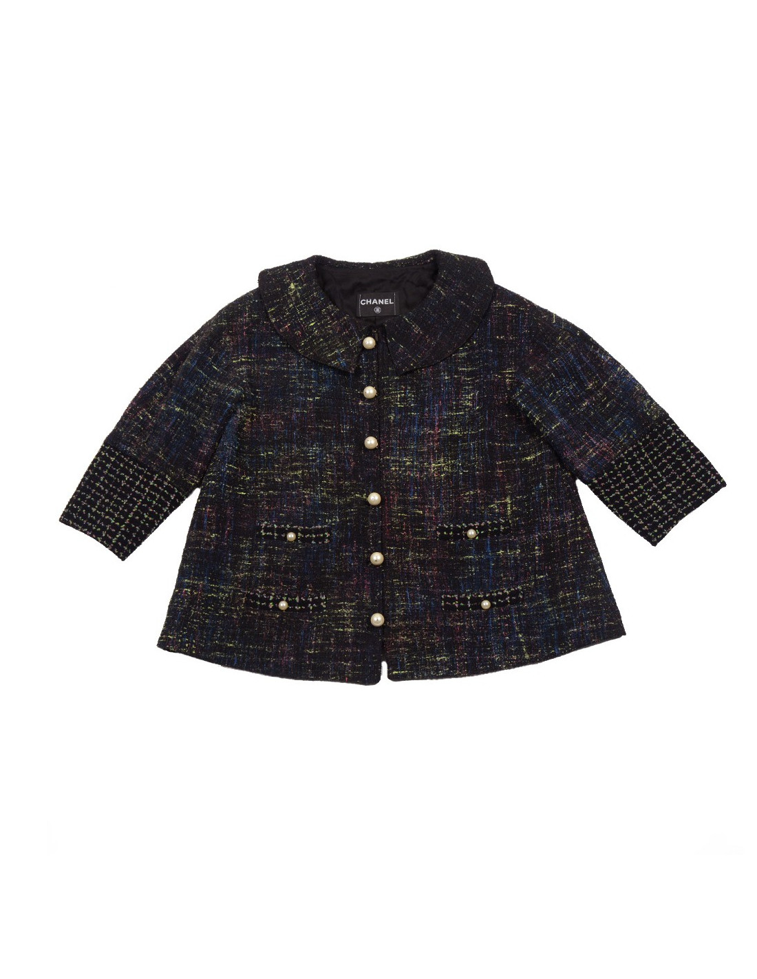 Gorgeous Chanel jacket a-line tweed and Pearly pearls, summer 2012, the tweed jacket is colored green, blue and Fuchsia on black background. There are two pockets of each side of the jacket, the main closure is zippered, the jacket features six fake buttons of pearly beads fasteners, the sleeves are flared at the bottom and has two buttons in Pearly beads. No label size/composition