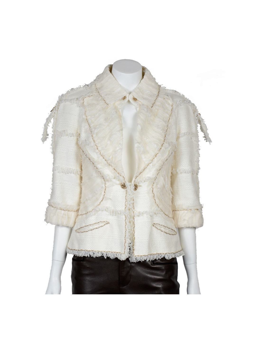 Very elegant Chanel jacket, ecru color, size 36. It is cotton with inlays of gold chains and bands of veil in silk. The buttons are 'CC' acronyms. The lining is natural silk. He is a recent collection. She is in very good condition. She has 3/4 sleeves.