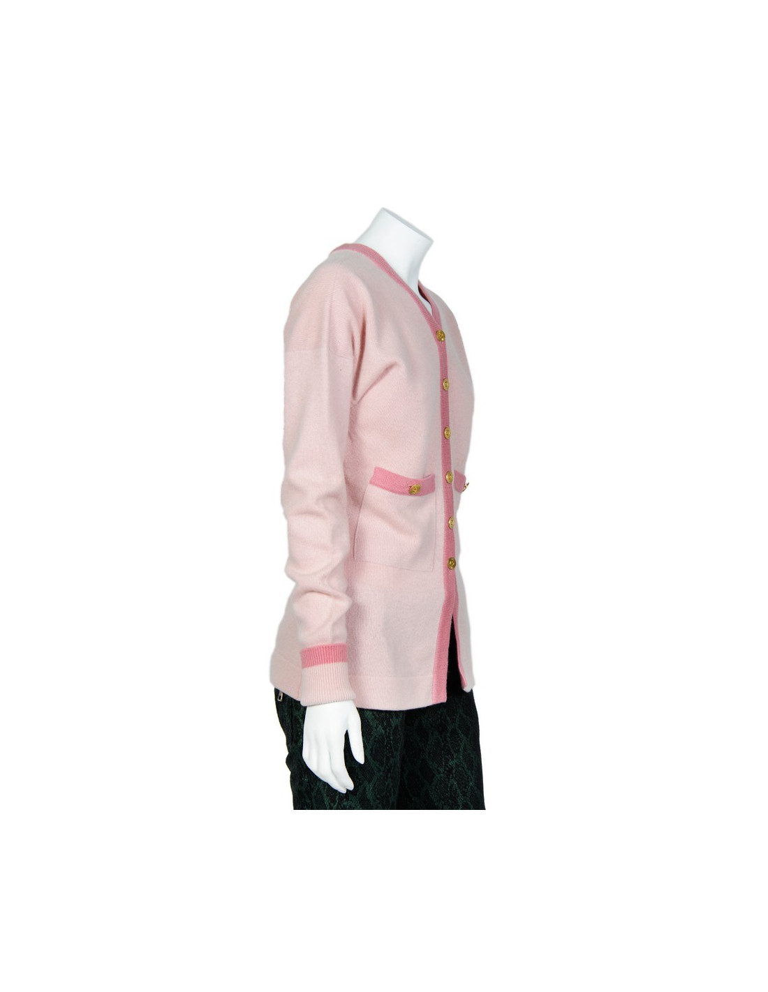 Cardigan pink Chanel vintage cashmere. No size tag, is equivalent to a 38. Closing 6 buttons sewing Golden with the "CC" logo in the Center. It has two plated pockets closed by a button also. The borders are pastel pink. In very good condition.