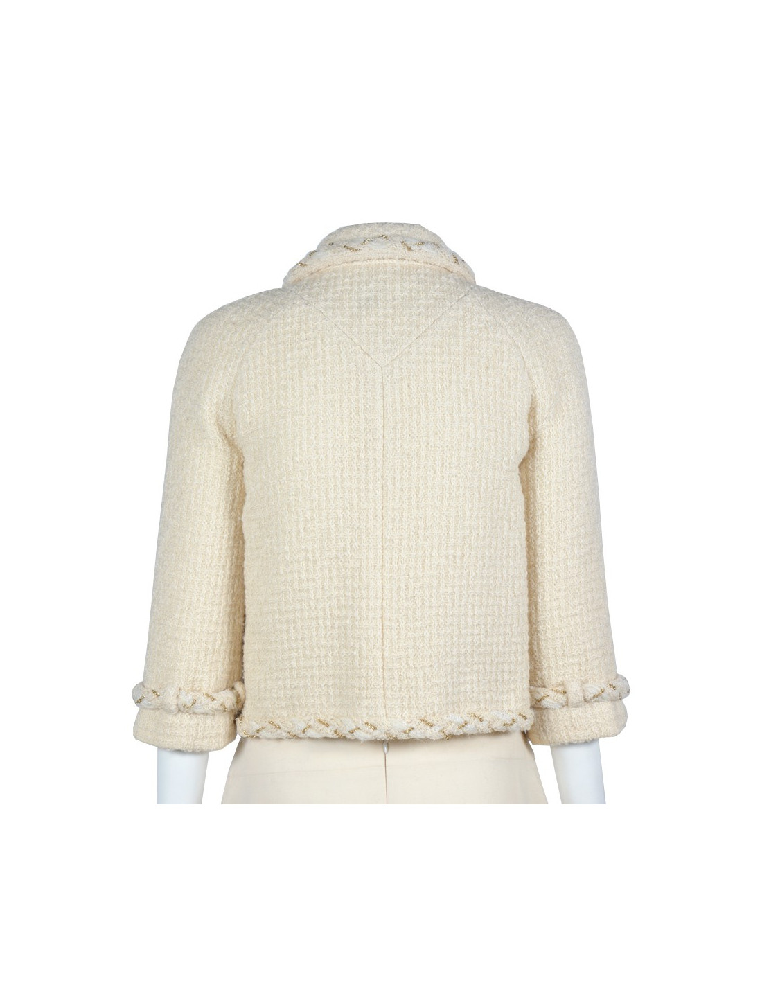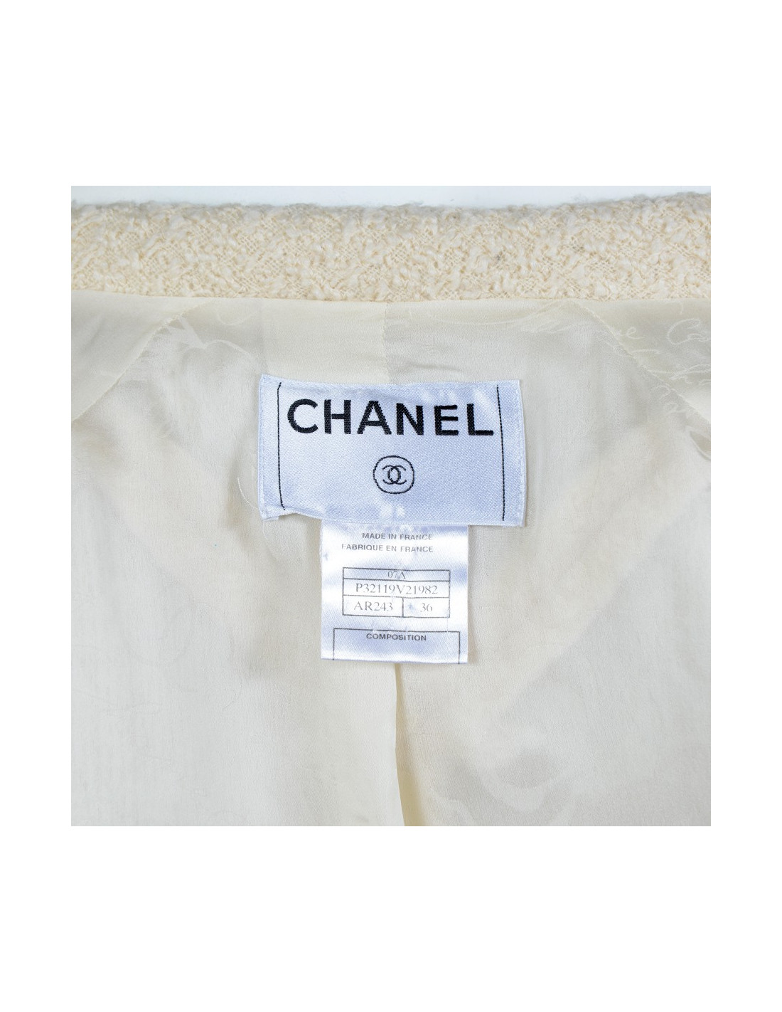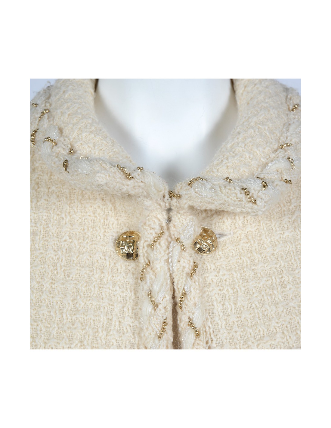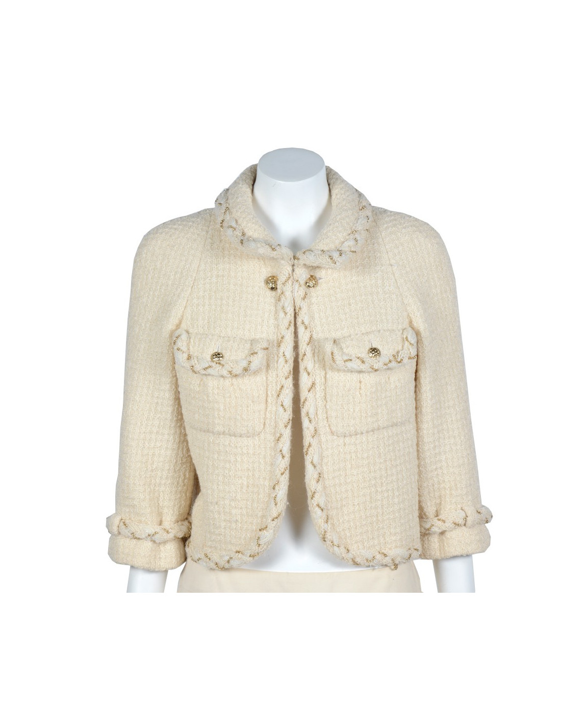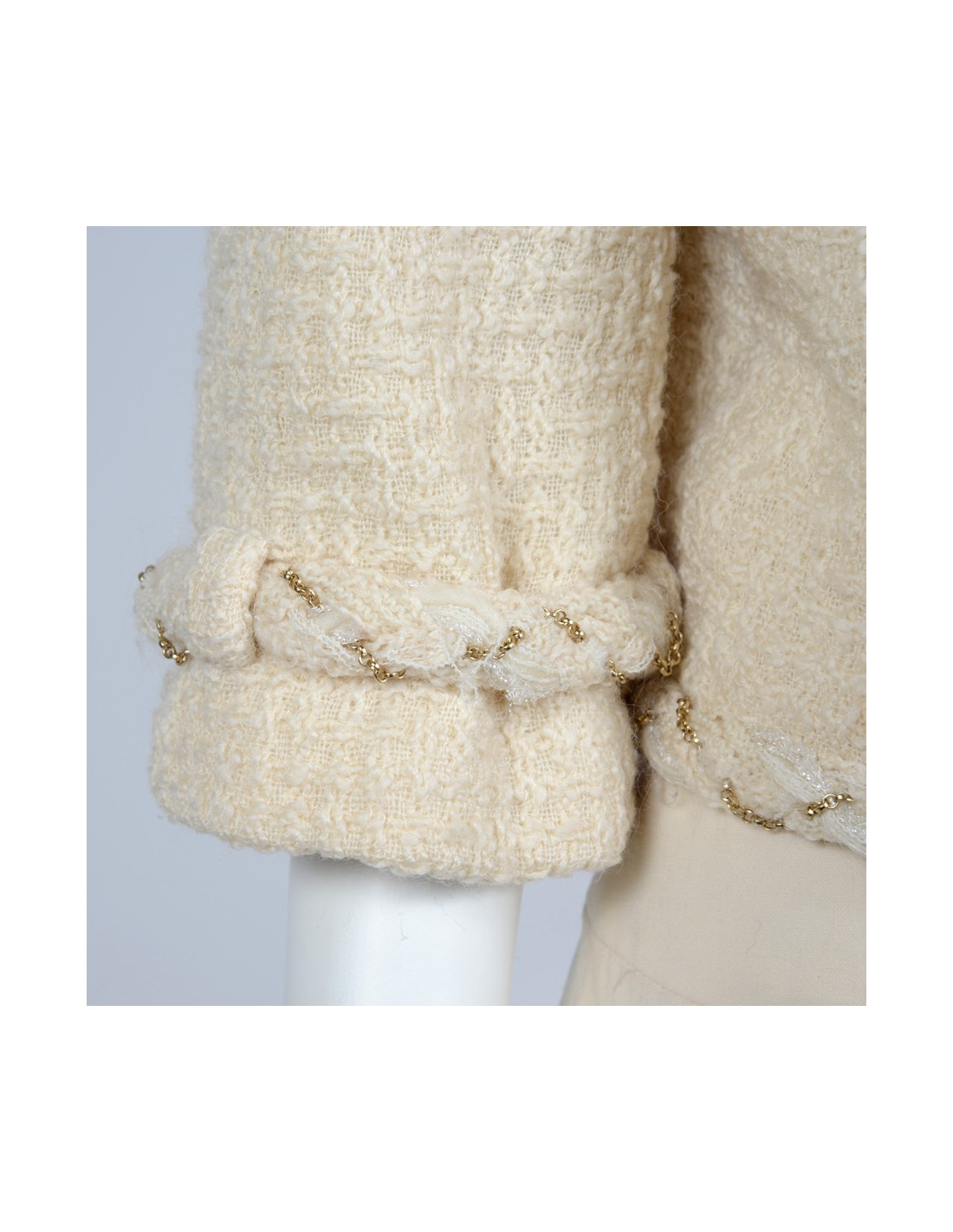 Sublime House Chanel jacket size 36, fall-winter 2007 Collection in beige tweed and silk Interior. All edges are trimmed string metal end Golden, lovely gold CC buttons. Closure at the collar with two buttons connected by a chain (and a hidden hook). Chain maintenance at the bottom of the jacket. Refined and beautiful piece. Two slight traces of perspiration on the lining at the level of the armpits despite a cleanup at a luxury cleaners (Germaine Lesèche). the jacket is still in perfect condition.
