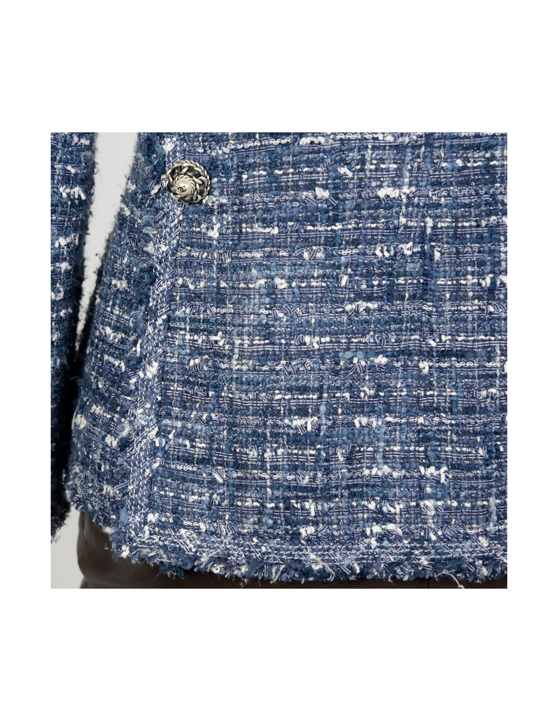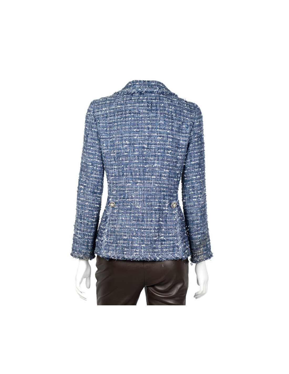 Iconic tweed blue and white spring T 38 Chanel jacket. Recent collection. It is topped of magnificent jewelry chain and leather buttons and Pearly beads and double black "C". (cleaning with germaine Leseche paris)