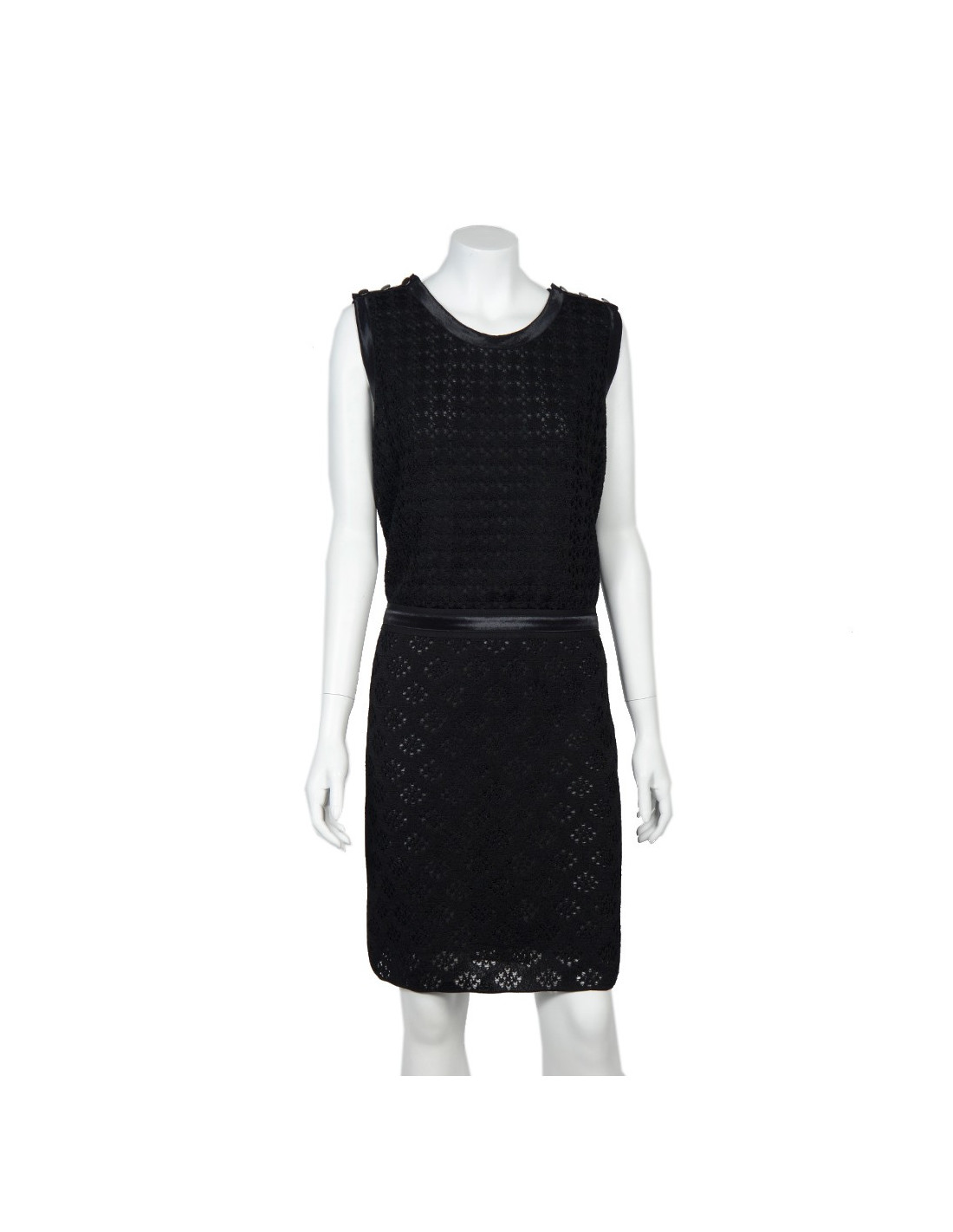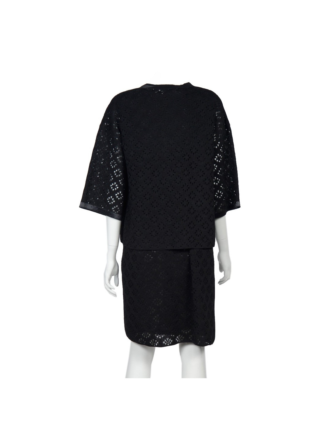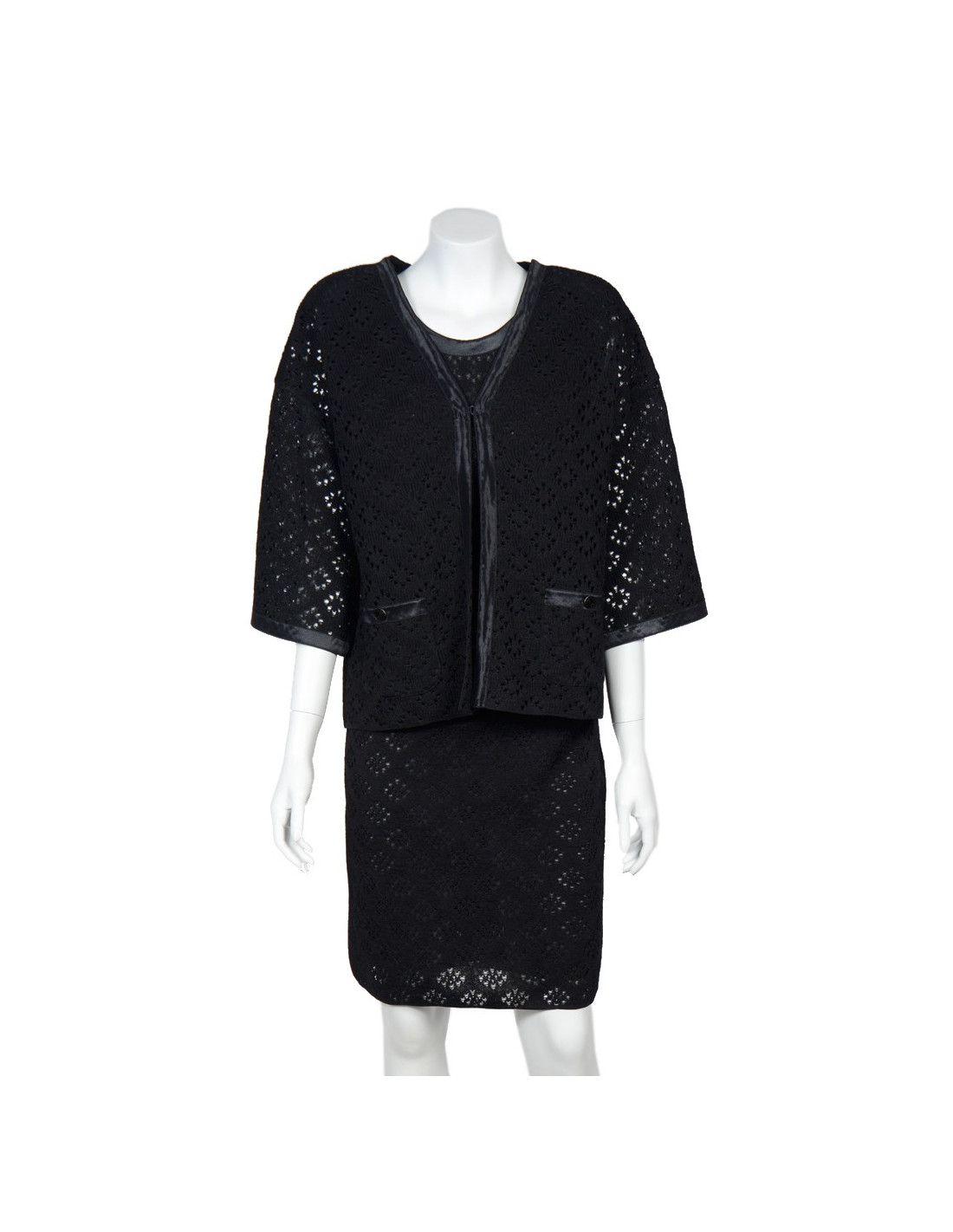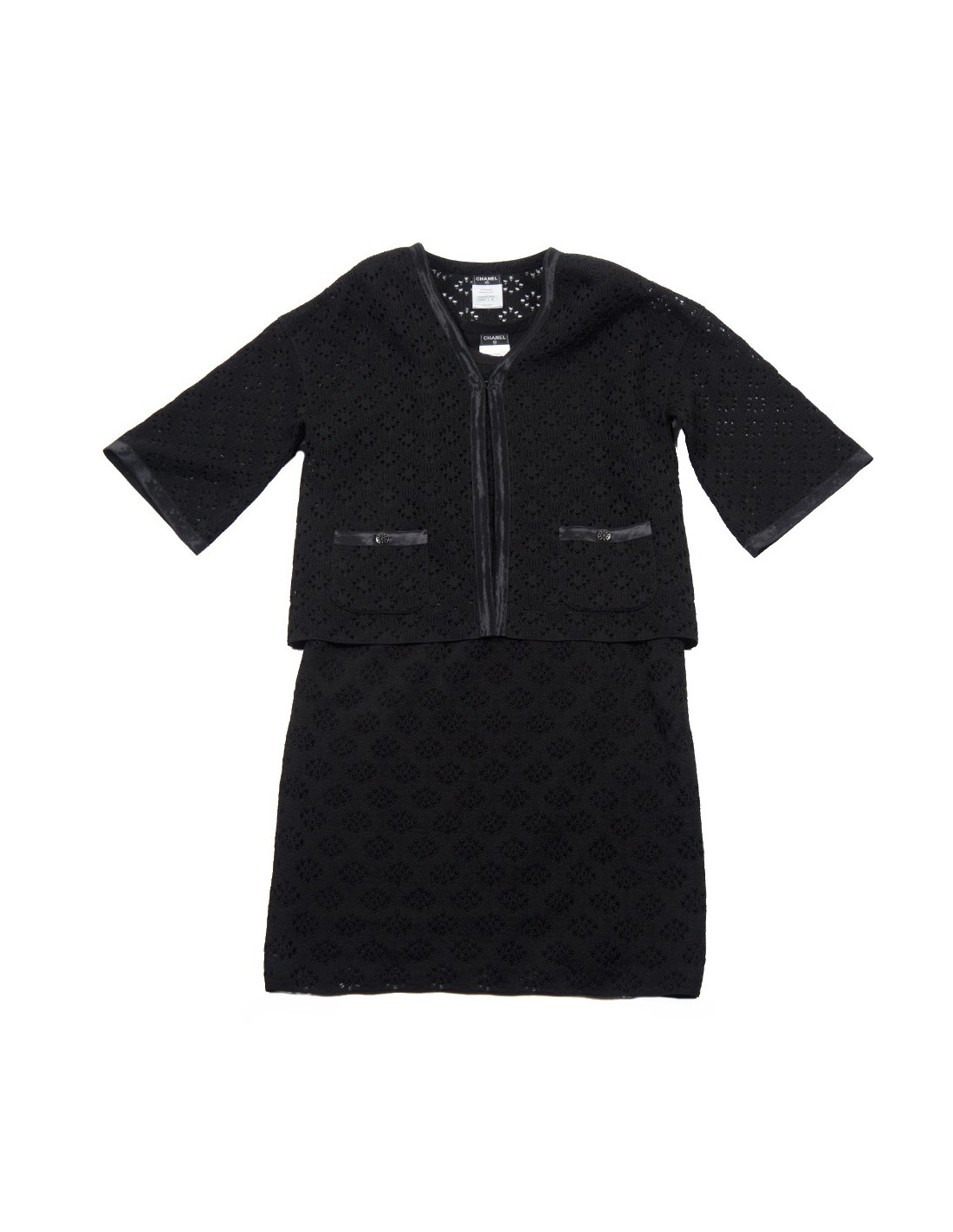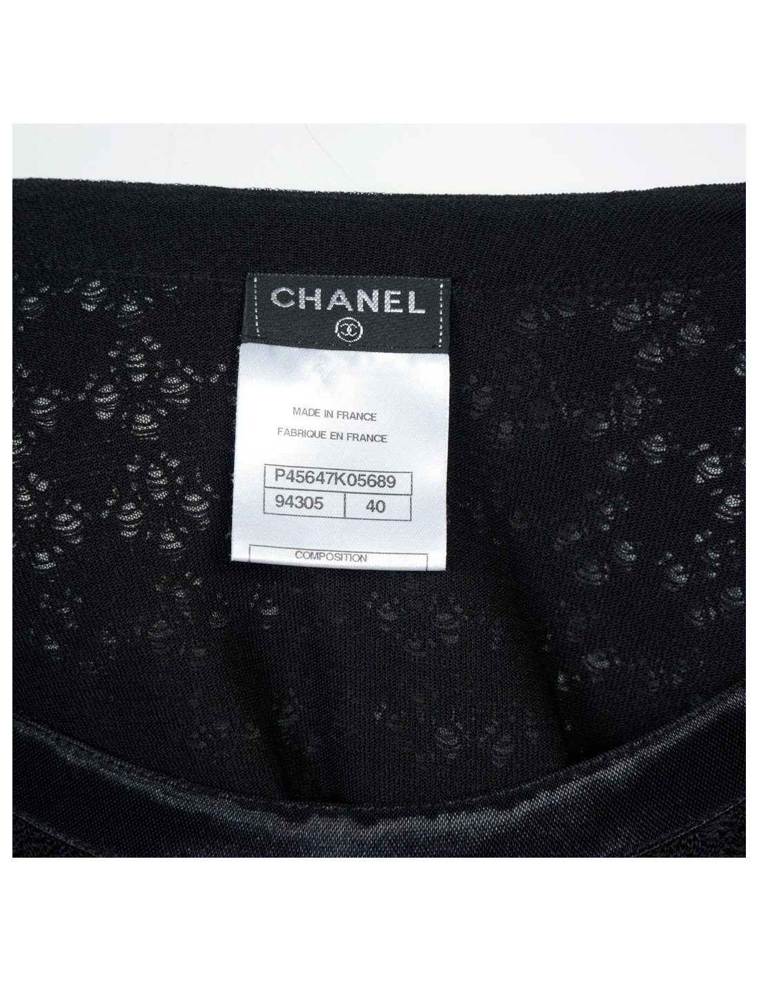 Together Chanel size 40, Black Lace 100% silk dress with lining and jacket 3/4 sleeves and shoulder pads. Collection new, never worn. The dress is sleeveless. The jacket has 2 pockets. The buttons are silver and enameled black with a double "C".