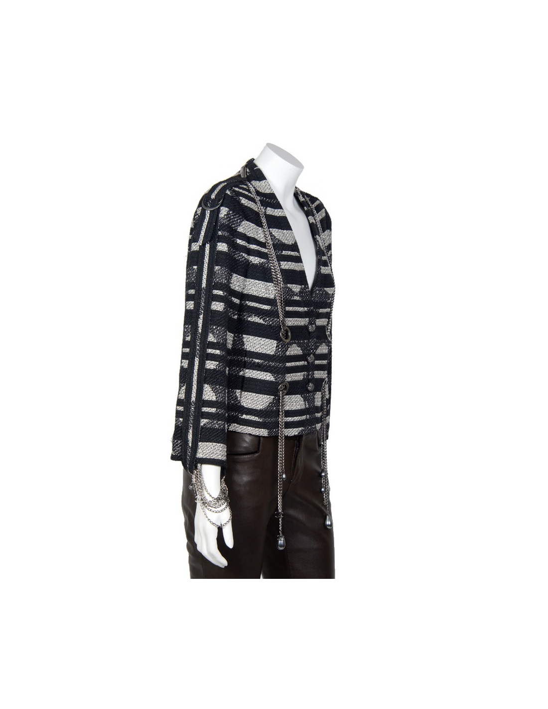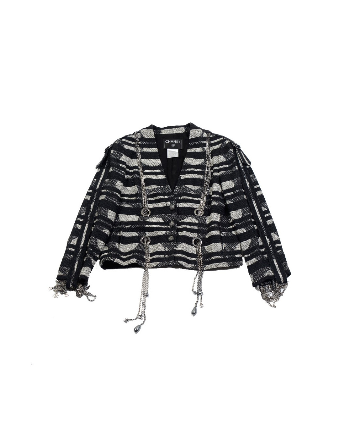 Sublime short CHANEL jacket t 38 spring 2008 collection, black and white, made of shiny black threads. The buttons represent the (expensive emblem to Mademoiselle Coco) lion's head she is decked out in jewels. Four chains silver travel jacket ending by gray pearls and a double "C" as well as on the handles, deductions by legs of tissue that closes by pressure.