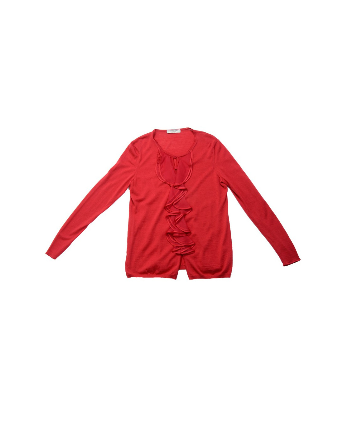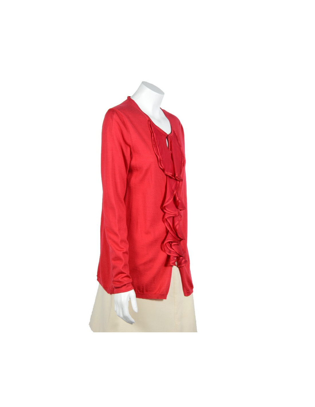 Valentino vest in red wool and silk. No size tag, is equivalent to a 40. It closes by nine small red buttons hidden behind gondolas. (is there a spot on the vest). It is in very good condition.