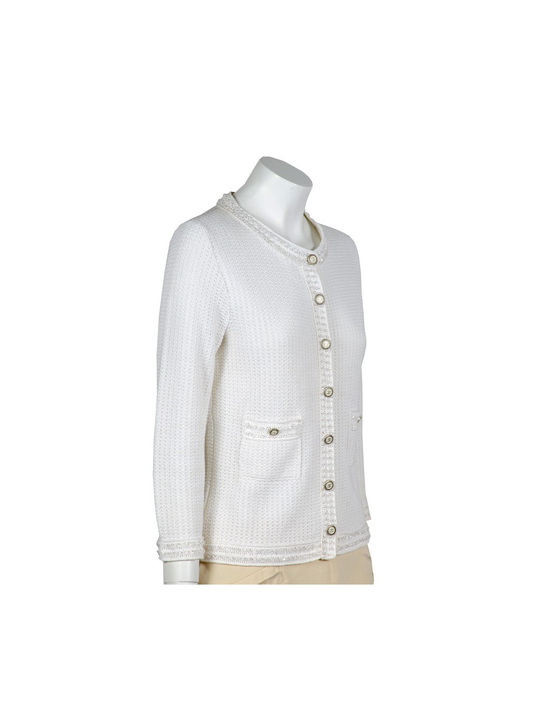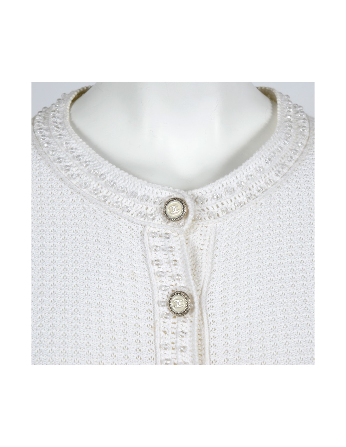 Lovely Chanel jacket, size 38, from ready-to-wear fall 2007, in unbleached cotton with a lizeret sewn by two rows of transparent beads. The buttons are interspersed beige and a double C Center. There are two pockets on the front. In very good condition.