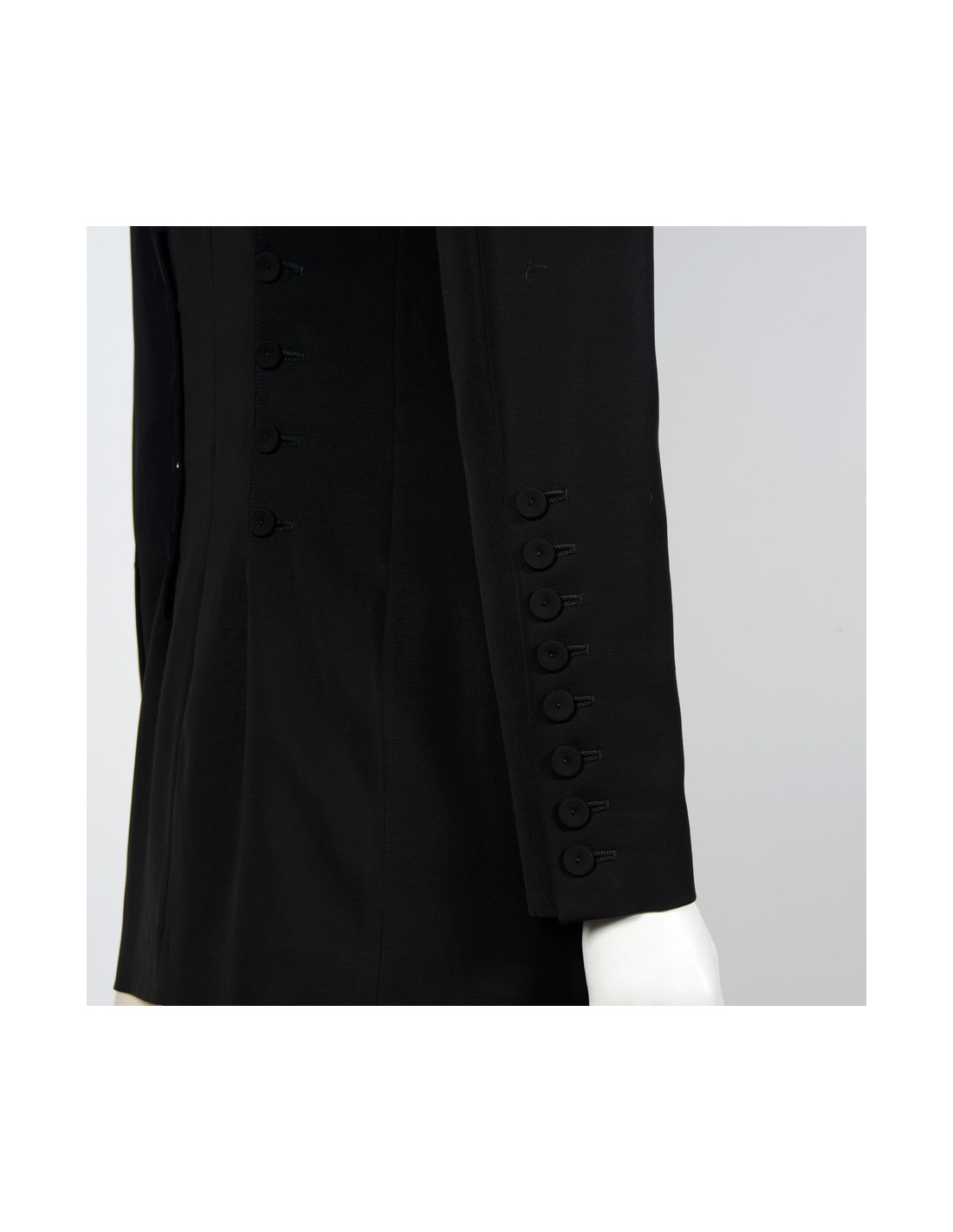 Great jacket, lining in good condition. Fake buttons in the structure back jacket. Eight buttons to each sleeve, give it a look very couture. Total length: 74 cm, sleeves length: 60 cm. Shoulders width: 39 cm, back width: 45 cm