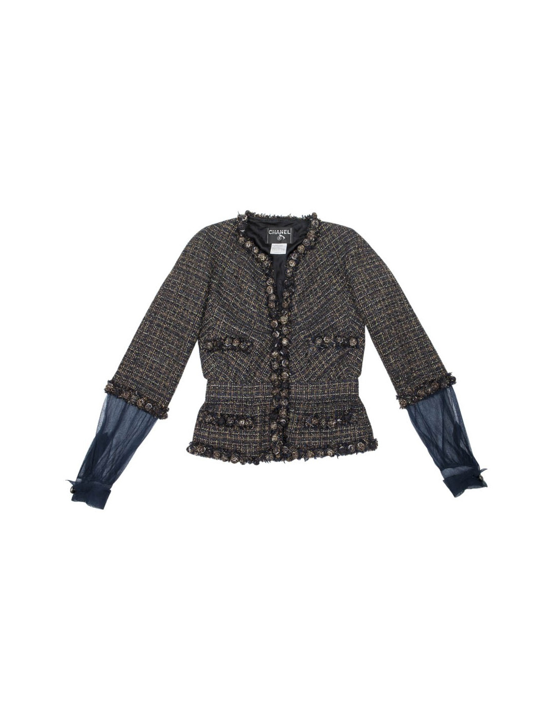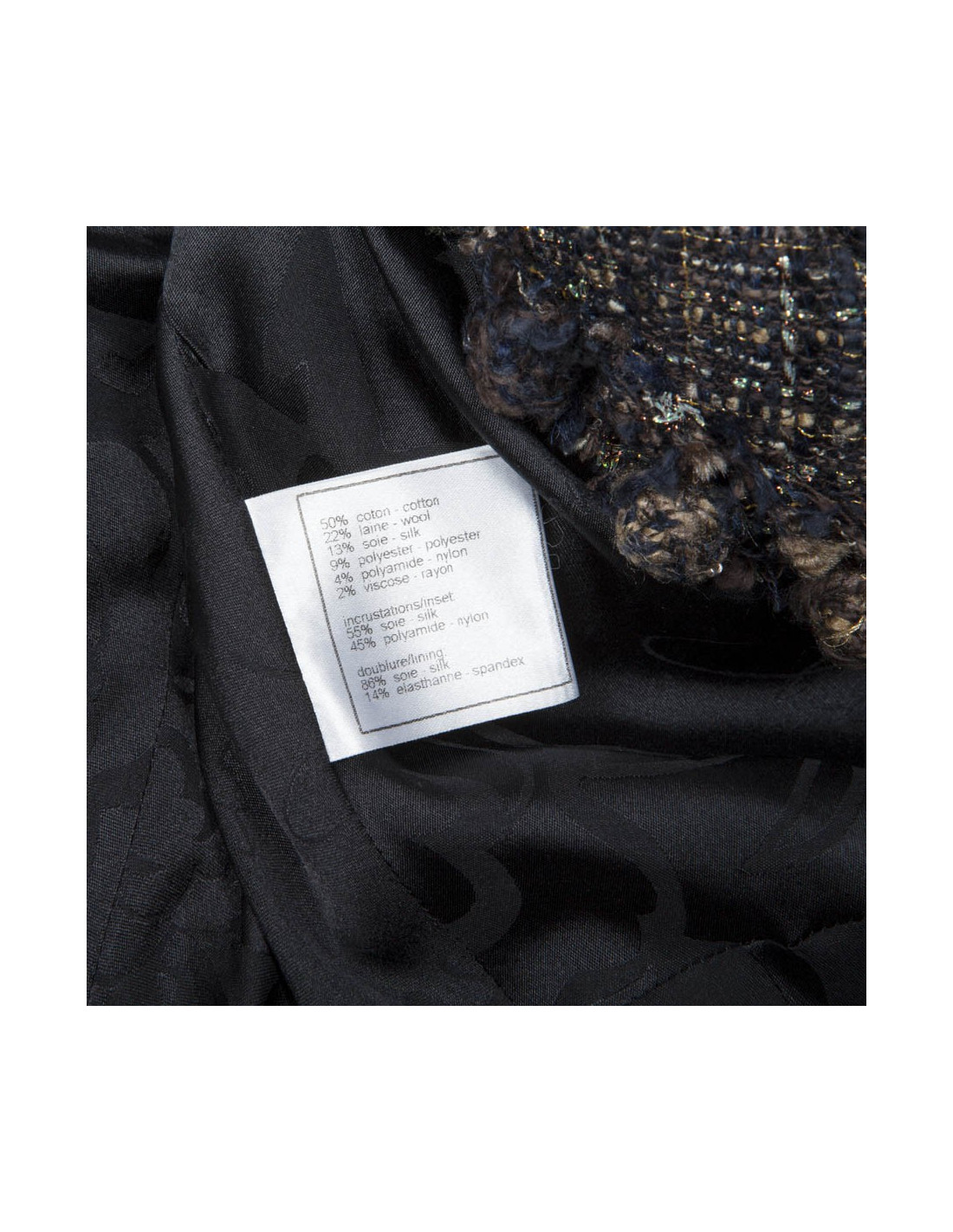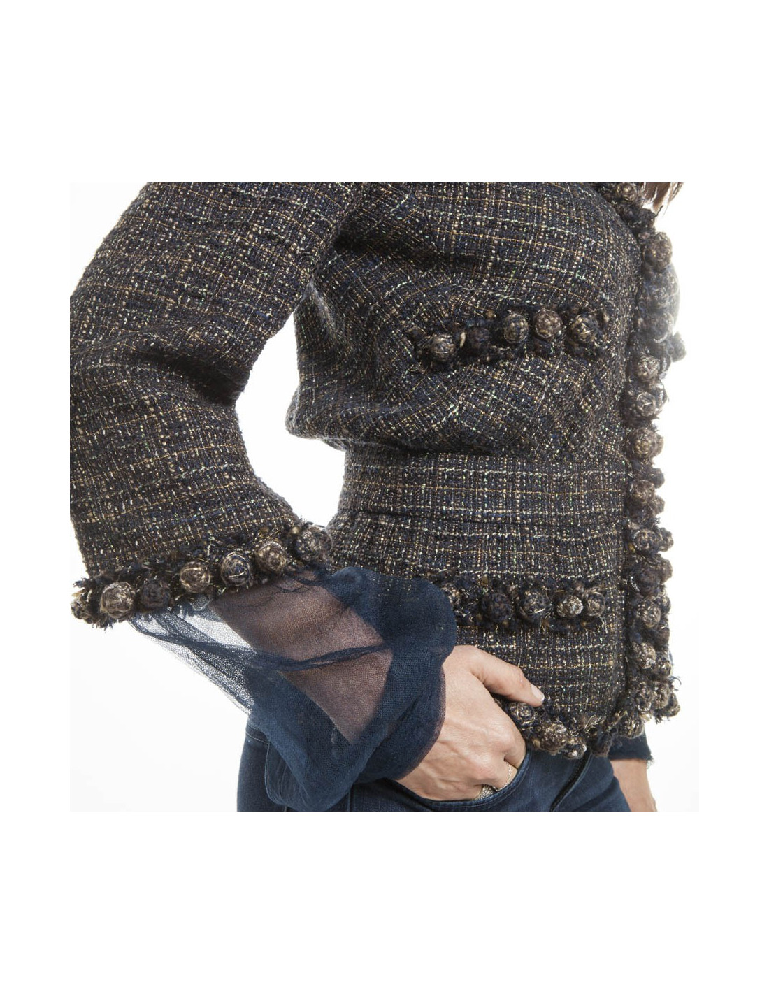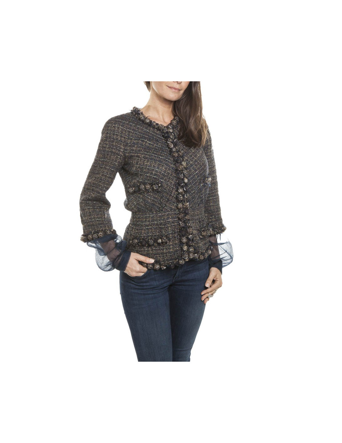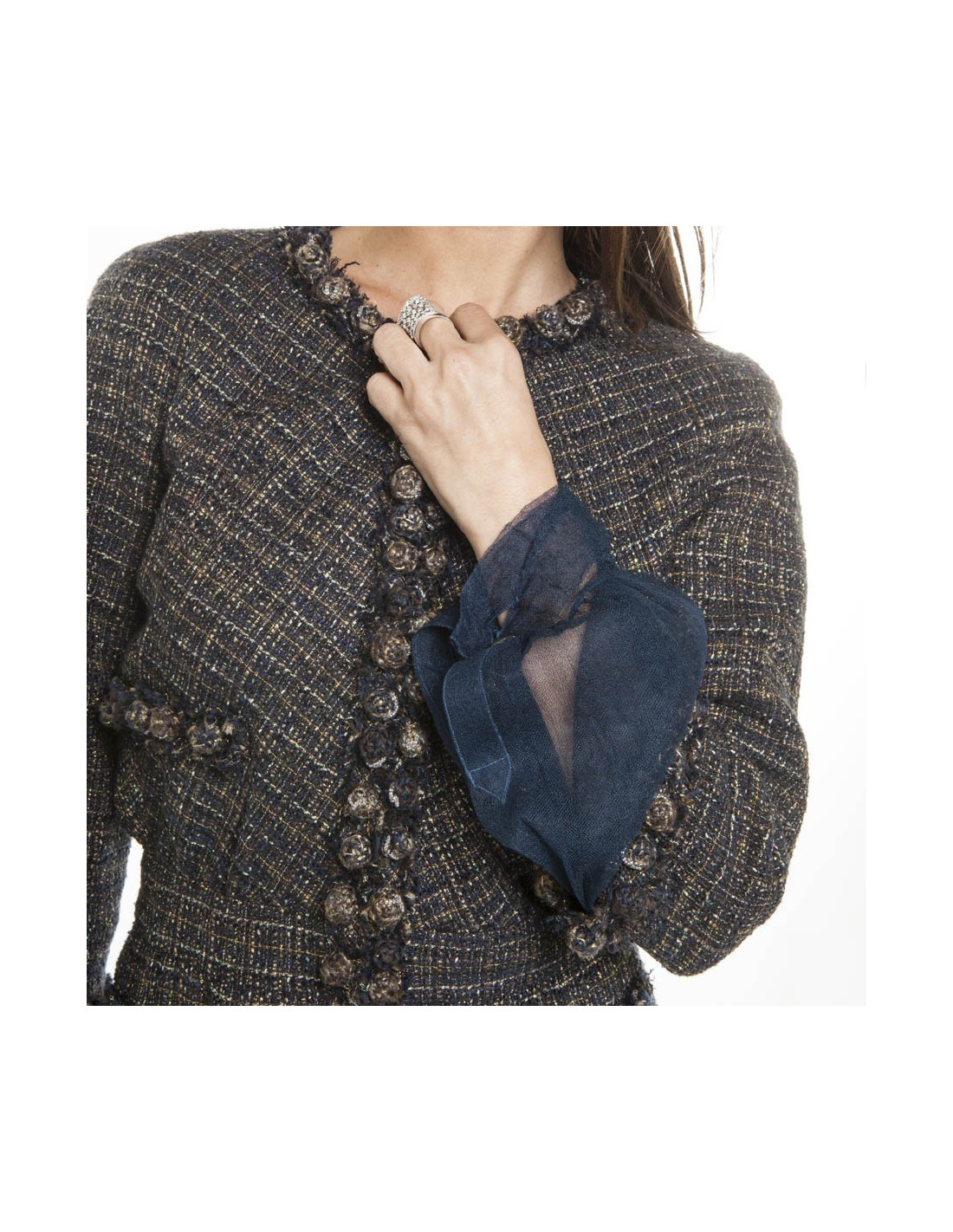 With fitted jacket to the size of the House of Chanel in multicolor tweeds: Navy Blue, green, silver, gray, Brown, purple wire, wire of gold, etc... Central locking with 7 hooks. Navy blue silk Monogram lining.