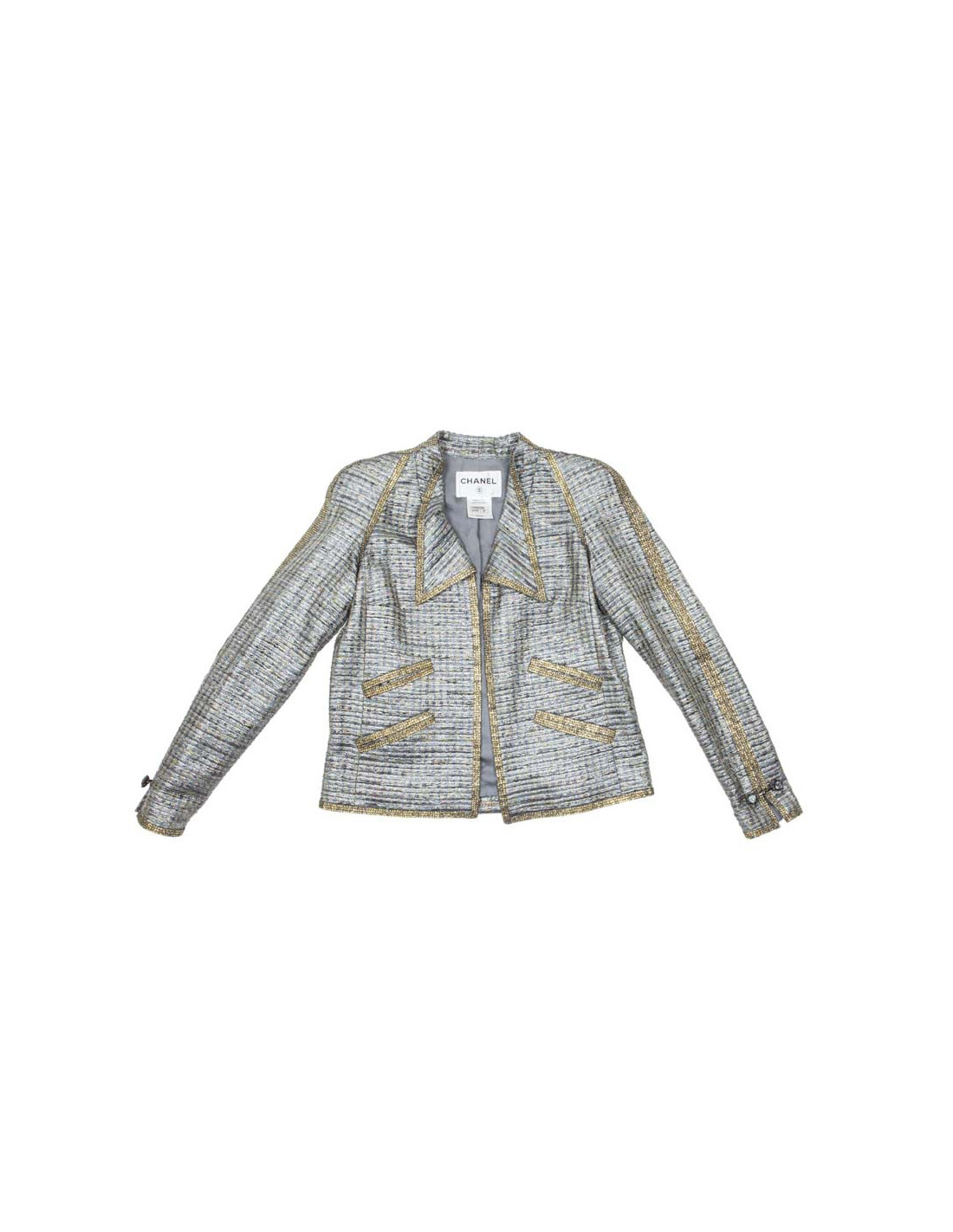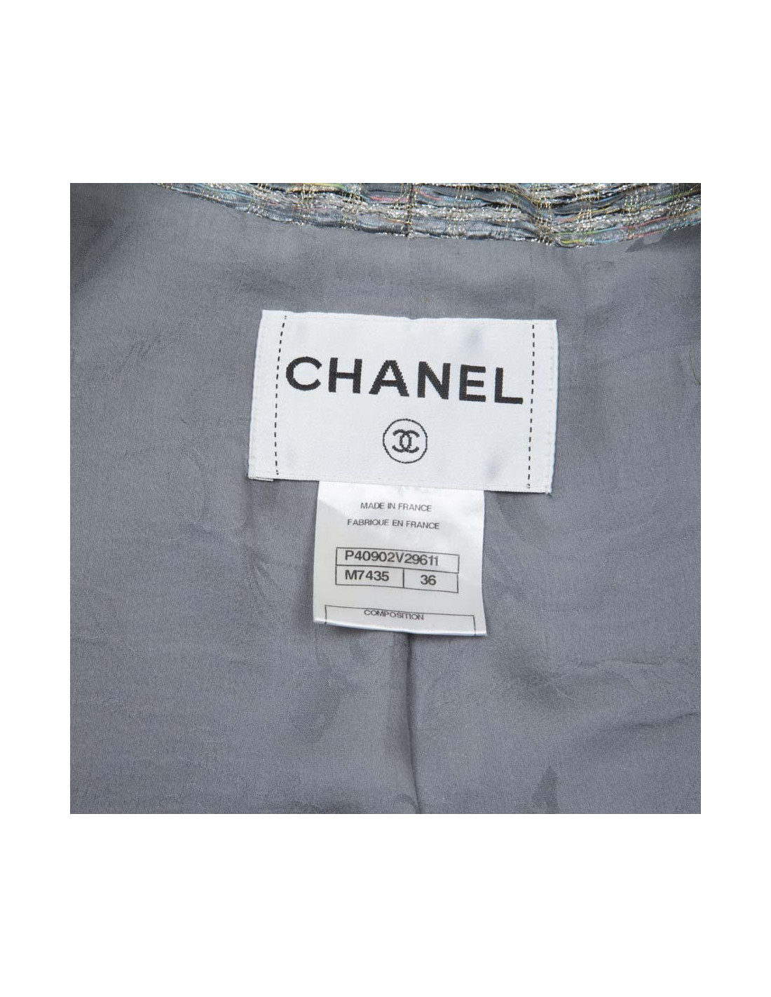 Sublime Chanel jacket, from Paris Bombay collection, ideal for a chic evening! It is made of pink, gray, green silver threads ... the arm and the pockets are embellished with yellow mesh crystal.