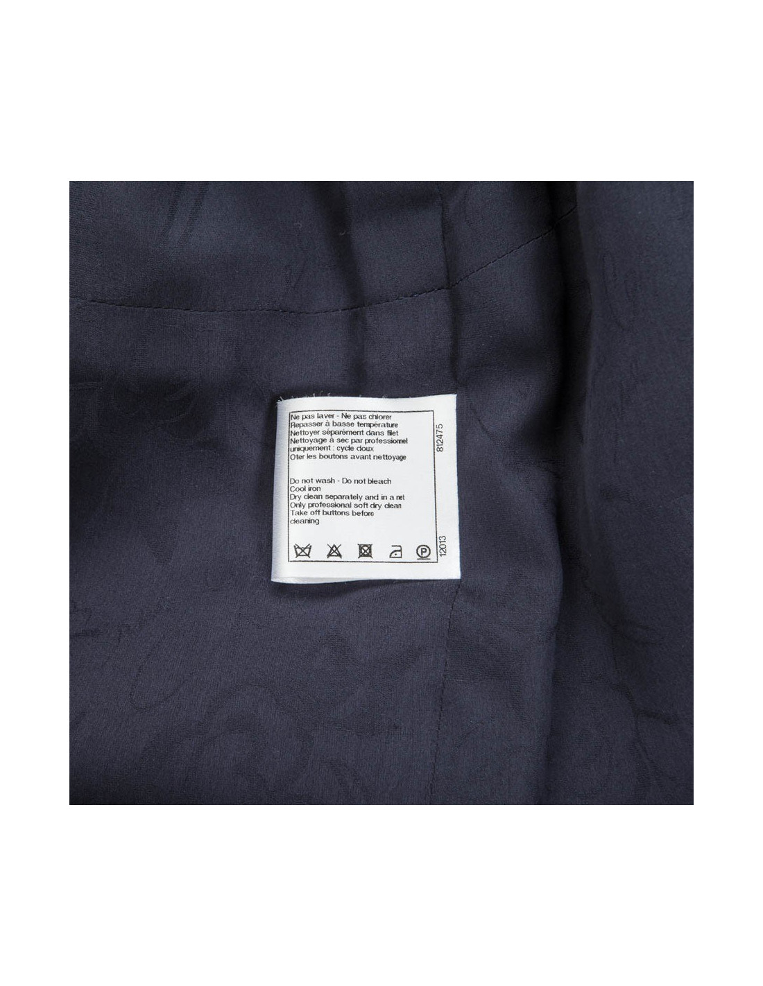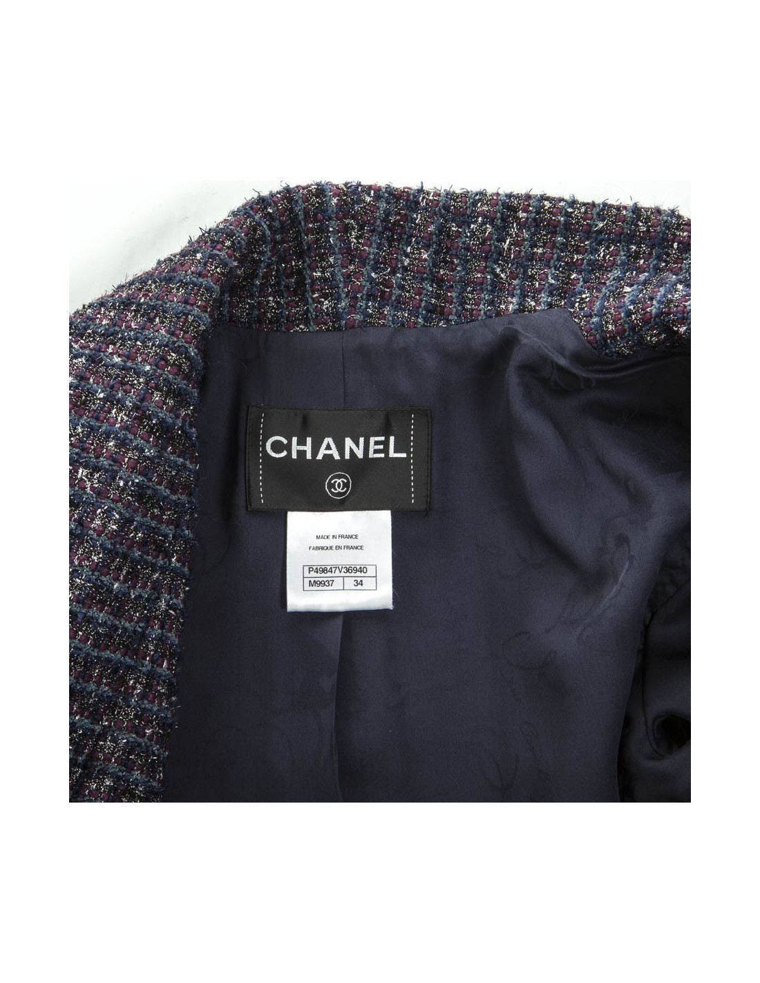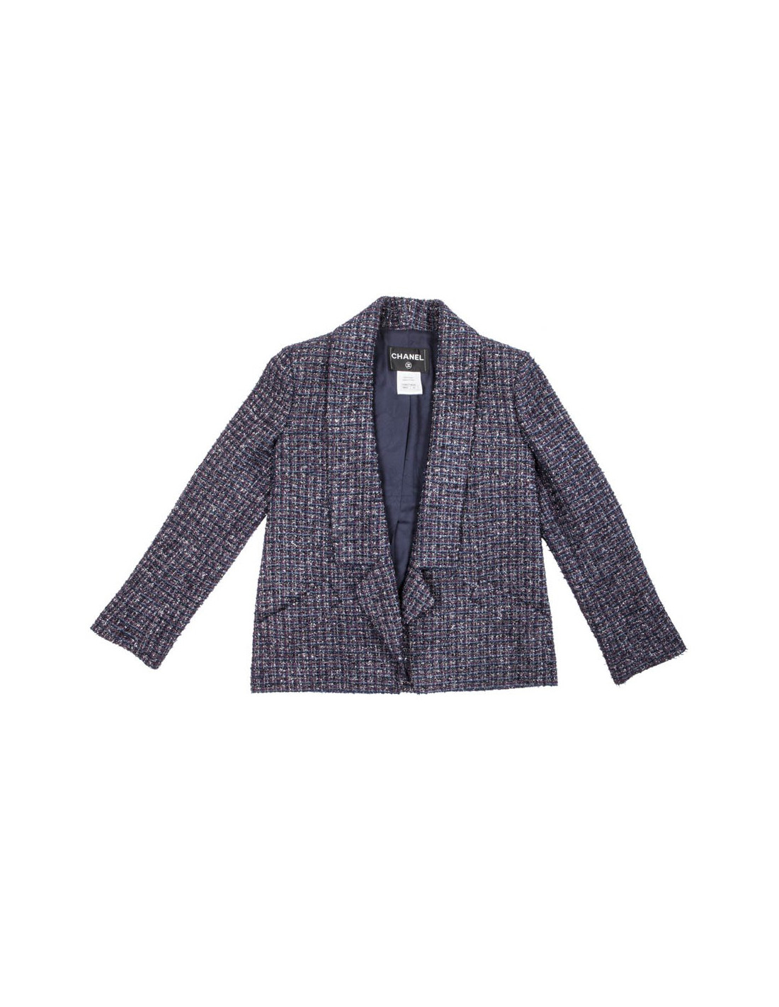Jacket of the House of Chanel in tweed with a gradient of colors: Navy Blue, purple, black and silver threads. Does not close. Two pockets at an angle on each side. Navy Blue lining silk camellias. In very good condition.