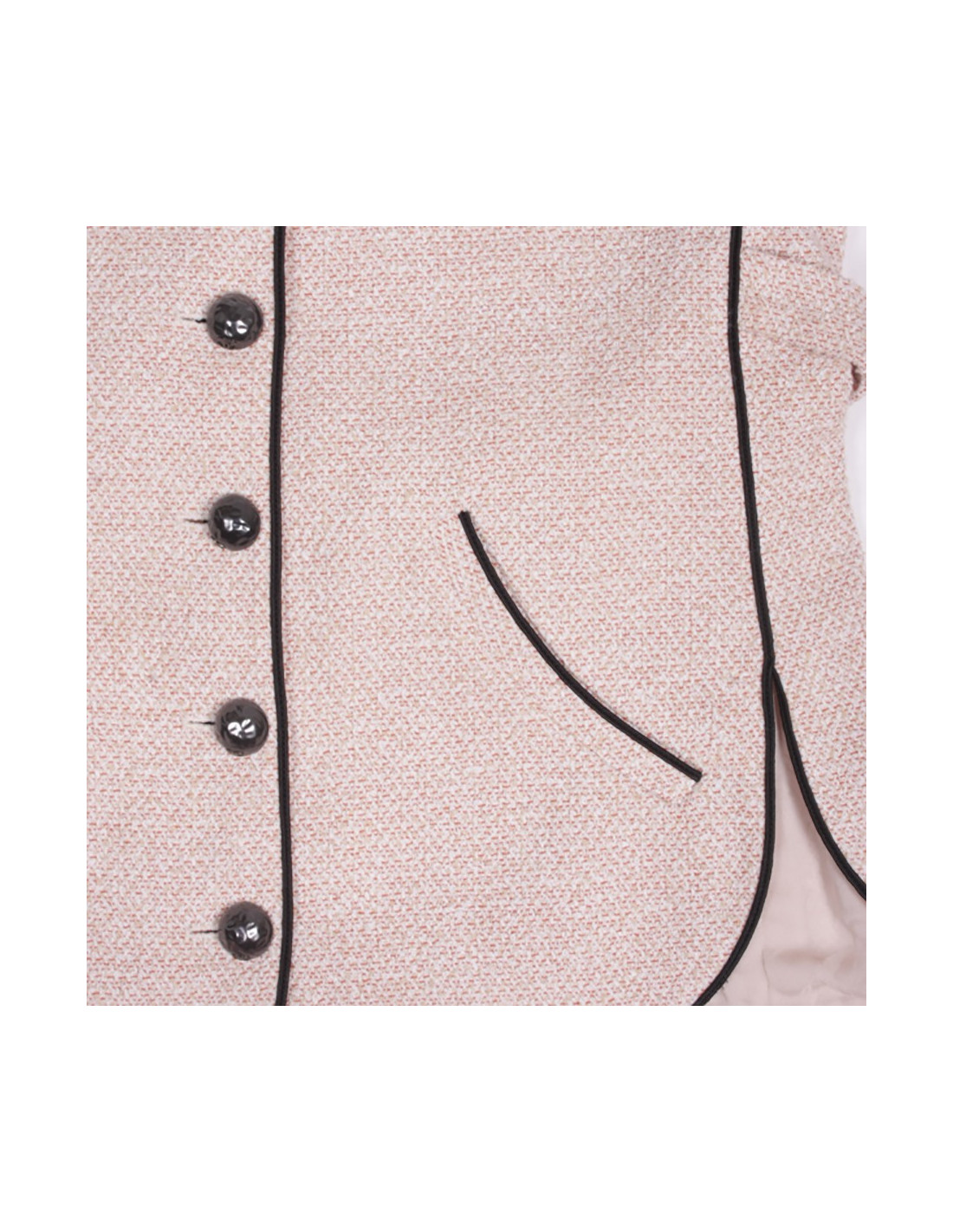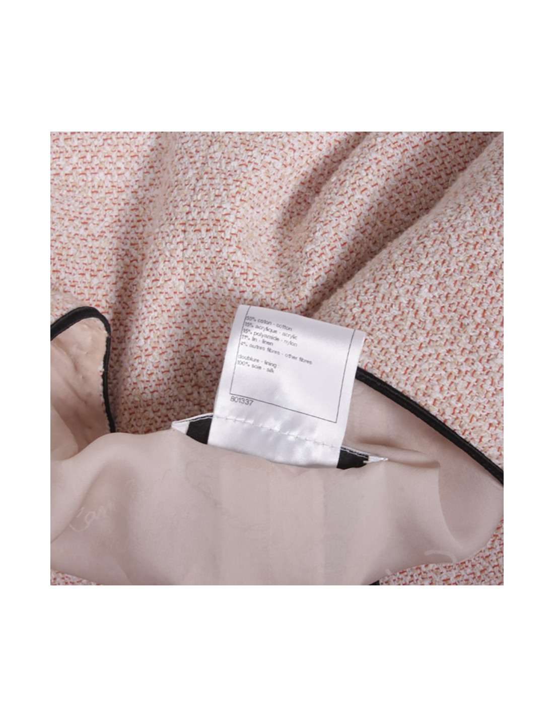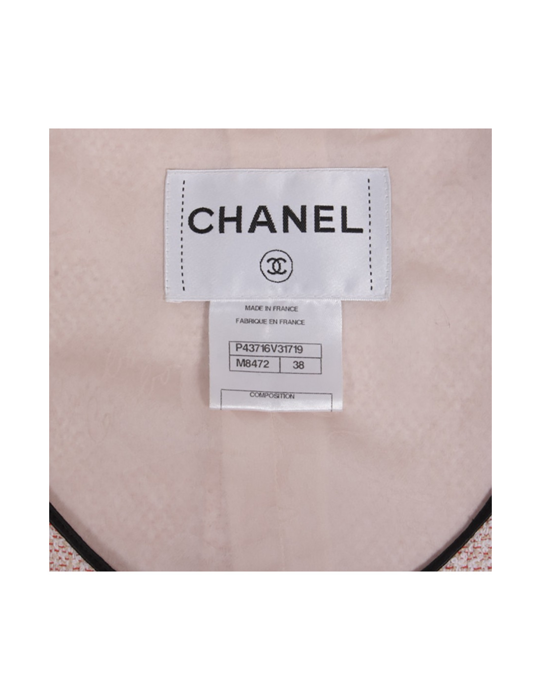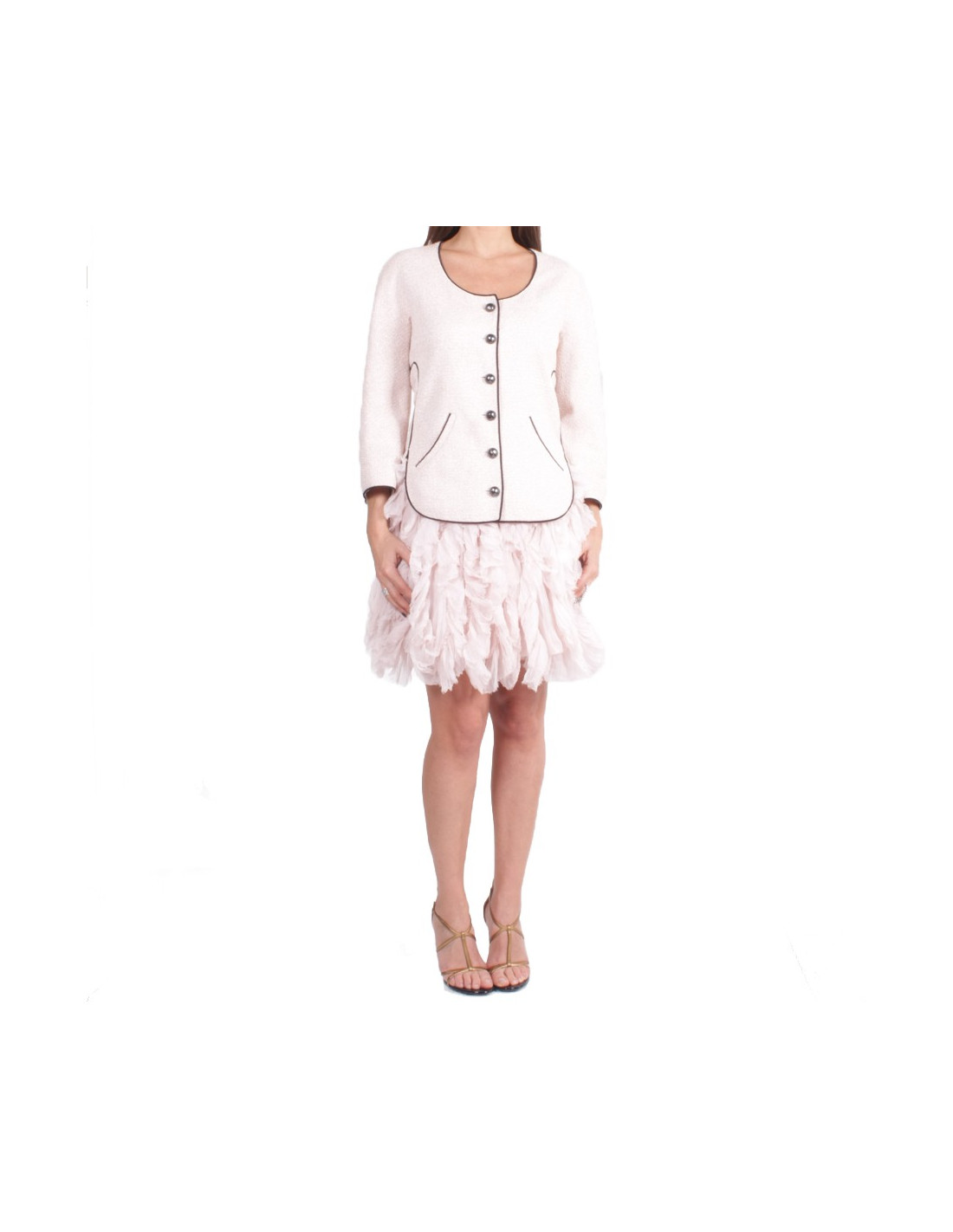 Very nice set CHANEL of the parade summer 2012 Collection "seabed". The jacket is gansée of a thin black edging pale pink cotton Tweed, the sleeves are 3/4 and the buttons are resin way hammered metal palladium acronyms CC. The lining is pink silk pale monogram. the skirt is pale pink chiffon with multiple vertical flounces that give it a nice fluffy effect. < /p > She is also lined with pink silk pale monogram. En très bon état. Flat jacket dimensions: width shoulders 38 cm. chest 44 cm, 45 cm, height 42 cm, total height 63 cm sleeves. Flat skirt dimensions: height 66 cm. hips 48 cm. total height 51 cm.