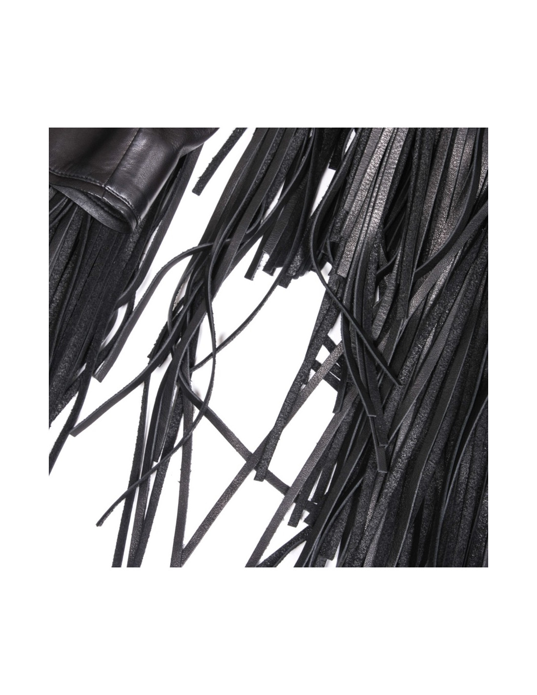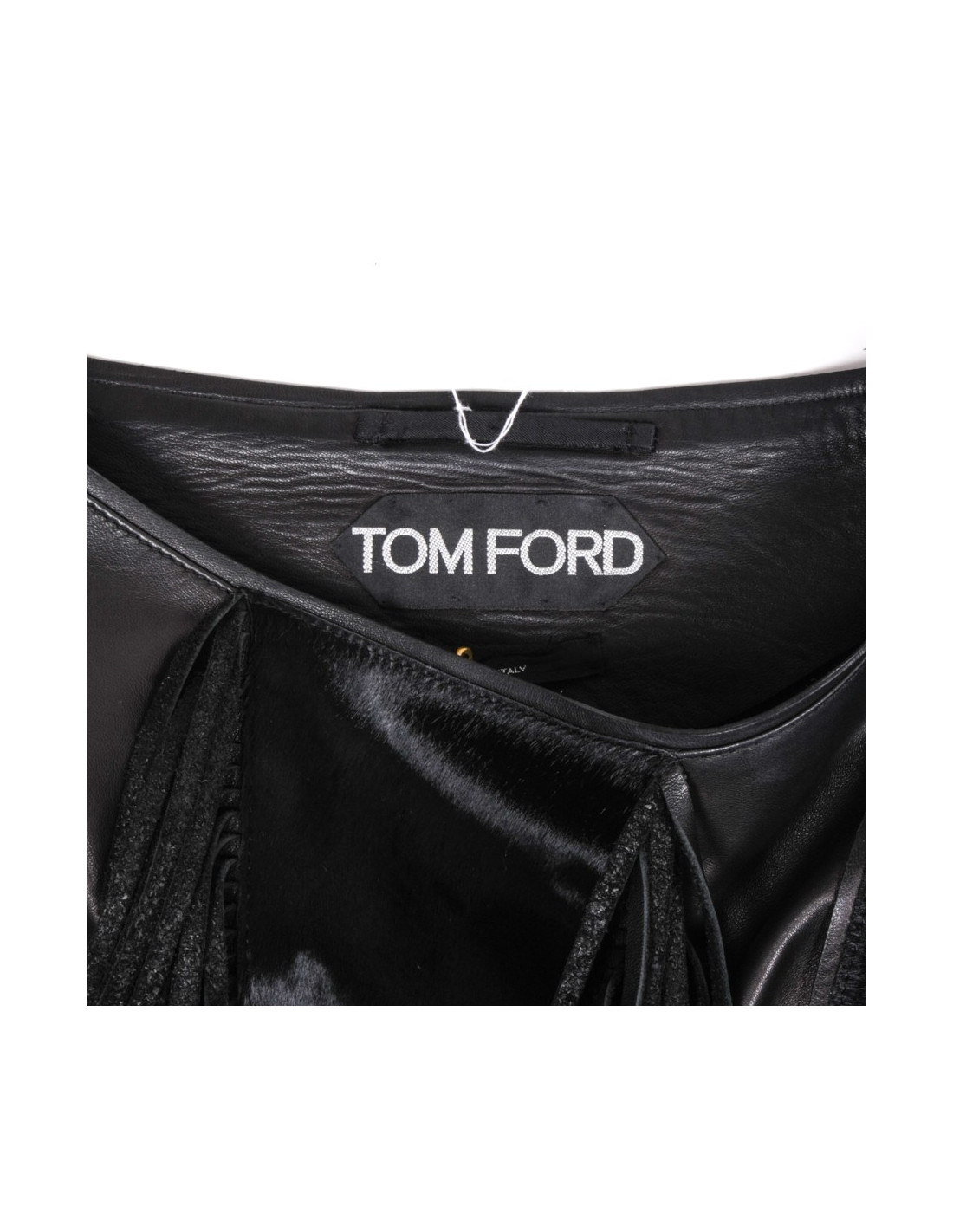Exceptional TOM FORD topof the AH 2013 parade in lamb plunged black with applications in black foal and long fringes along the sleeves, bust, in the back and on the bottom. Size 38 fr.