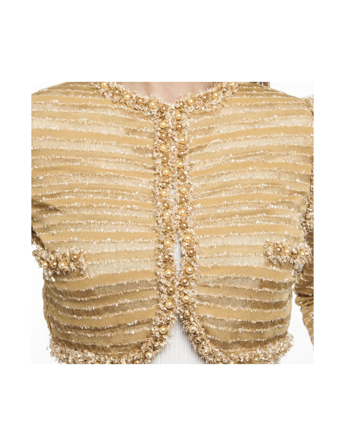 Chanel bolero, 2015 Dubaï cruise collection size 38 FR, in very good condition. It is covered with golden and coppered pearls. Completely golden with gold threads. Very close to the body. Ideal to wear as a bolero.