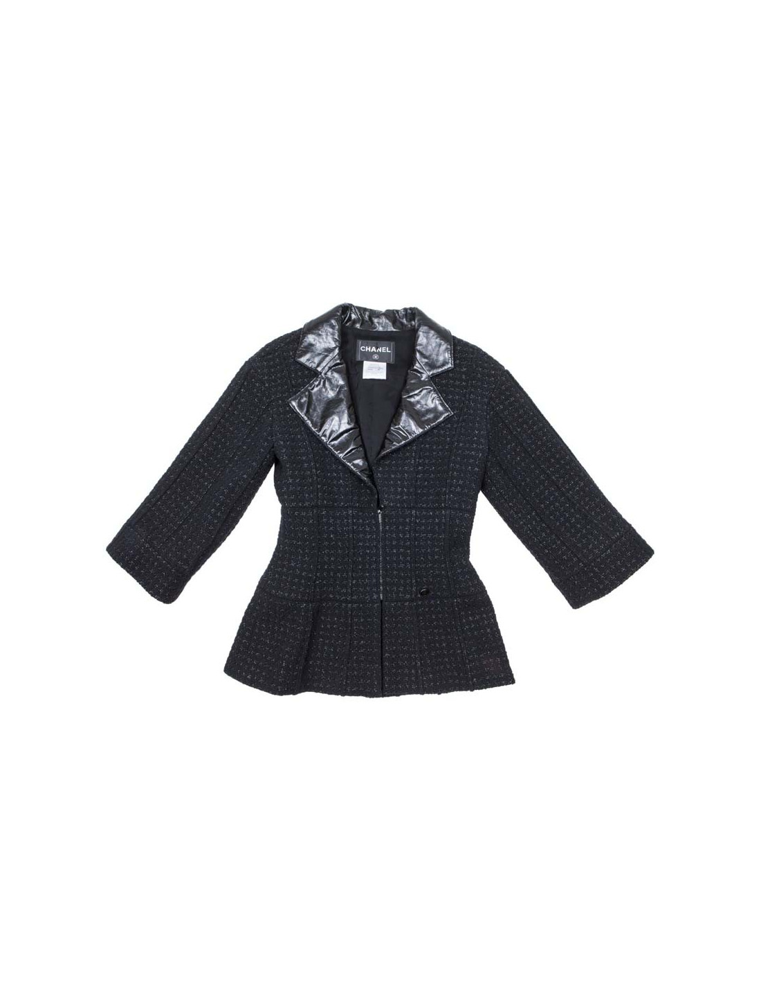 Pretty Chanel jacket in black tweed and shiny threads, with a polyester collar.